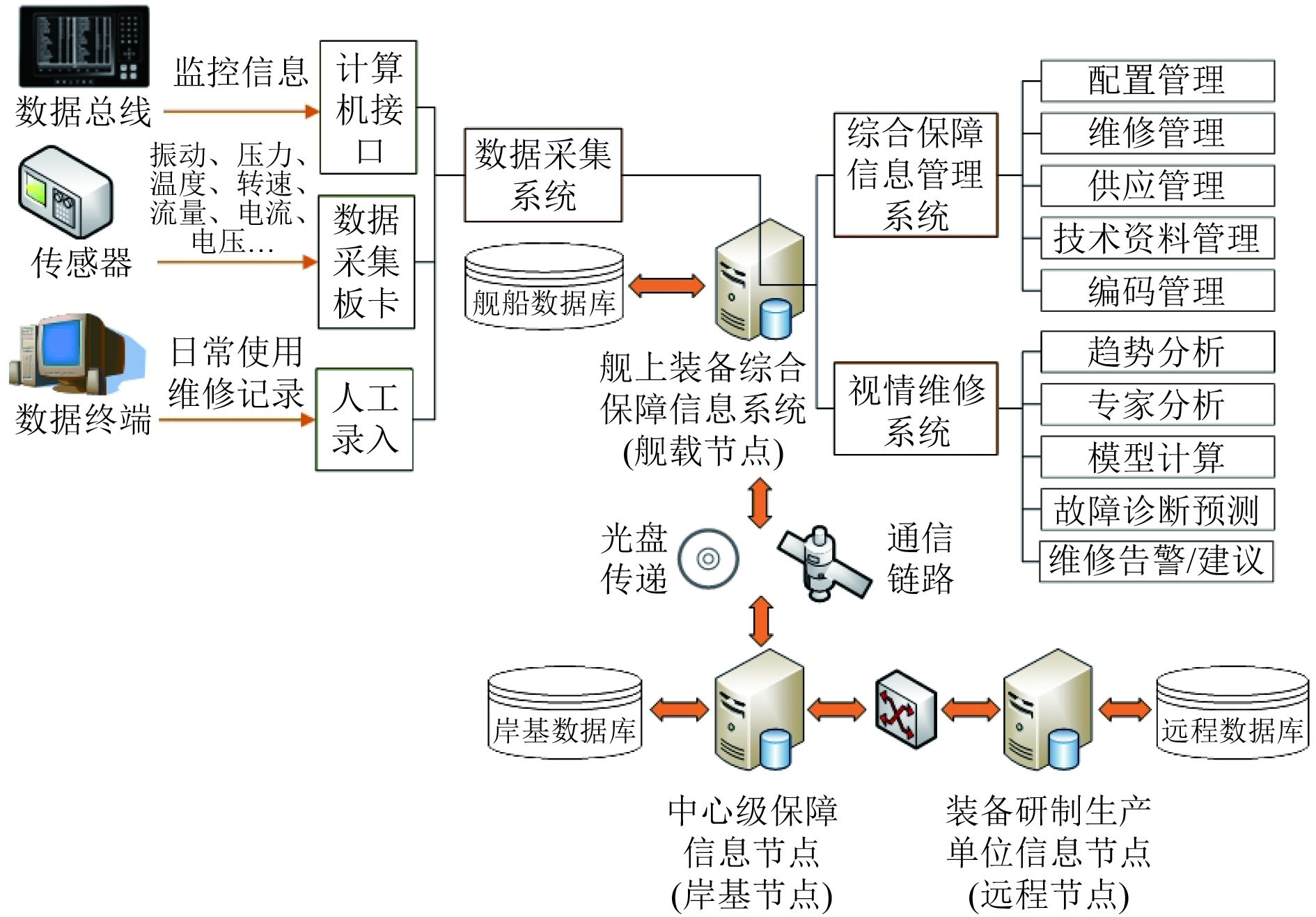 舰载节点是舰上装备综合保障信息系统,是系统平台的基础核心,主要包括数据采集系统、综合保障信息管理系统、视情维修系统,实现装备综合保障信息管理、辅助分析决策等功能。岸基节点是工业部门靠前保障的中心级节点,对保障覆盖的多个舰载级节点进行集中对口管理。远程节点是多个装备研制生产单位节点,对中心级节点提供远程技术支持。