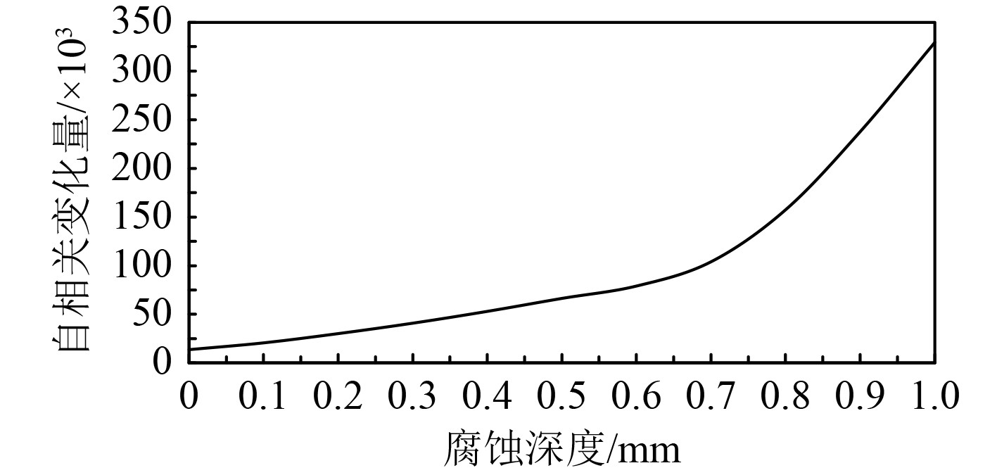 可以发现,其自相关变化量成不断增加的现象,且随着腐蚀深度的不断增加,其自相关变化速度不断变快。主要原因在于腐蚀程度越大处管壁厚度越低,涡流差异愈发明显,因此其探测效果越明显。因此,平面高频涡流反射自相关检测在一定范围内可以实现艇用海水管路的腐蚀探伤作用。