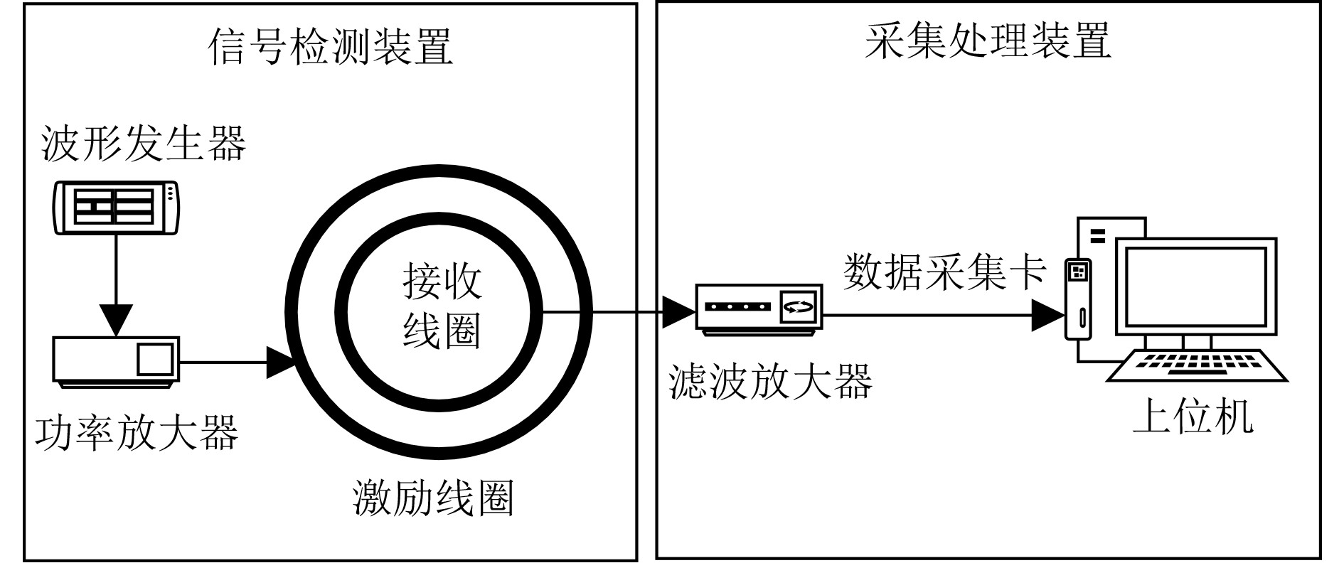 2 高频反射探伤硬件构建探伤检测装置硬件设计可以根据功能划分成2个功能区,即信号检测装置和采集处理装置。其硬件架构设计如图2所示。