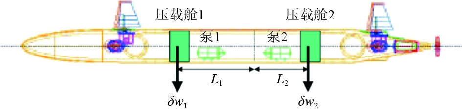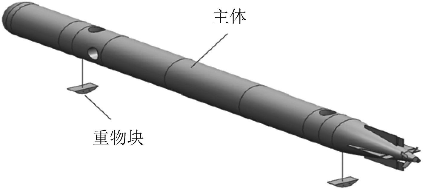 1.1 传统锚无人潜航器使用重力锚[4]或抓力锚通过锚链将自身停驻在海底是一种早期构想。该方法受锚雷启发,将回转体水下航行器整体设计为负浮力,释放携带在无人潜航器头尾2段的重物及锚链后无人潜航器主体转变为正浮力,在正浮力的作用下不触底,并可通过控制系统与垂推调整锚链长度与浮力,实现姿态控制。“驻留—航行”转换时,由锚链释放机构解除重力锚对航行器的定位束缚(见图2)。