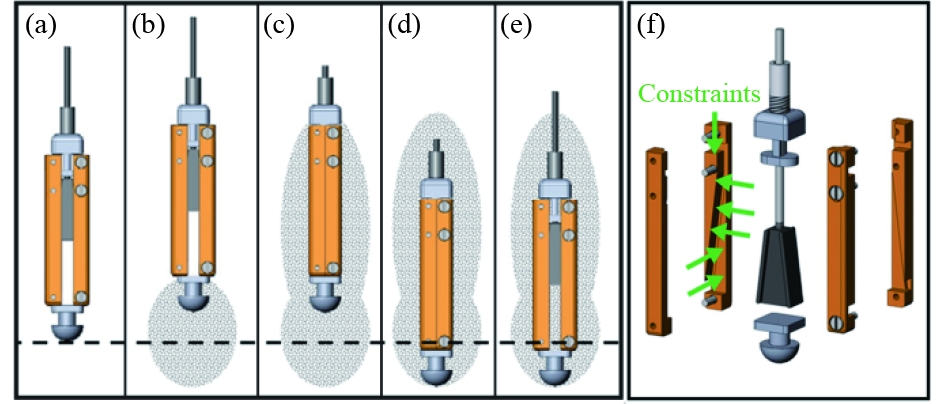 仿生锚也是重复驻留技术中的一种重要技术路线,其中RoboClam[22]是一种极具代表性的技术,由麻省理工大学模仿大西洋剃刀蛤(Ensis directus)在海床挖掘方式设计的一种仿生挖掘机器人。Winter等[23]对大西洋剃刀蛤的运动可以局部液化周围土壤的现象进行研究。当其收缩蛤壳时,会降低蛤壳和周围土壤之间的应力水平。在某个应力水平下,水平和垂直应力之间的不平衡会导致大西洋剃刀蛤附近的土壤失效。持续的蛤壳收缩会将土壤孔隙中的水吸入大西洋剃刀蛤,孔隙水与失效的土壤混合,形成局部流化区域。其团队结合大西洋剃刀蛤的挖掘方式、壳的收缩时间、挖掘性能和土壤局部液化的机制进行研究,并设计了气动活塞驱动末端执行器的RoboClam样机[24 − 26]。通过实验证明了局部液化贯入的方法能够显著降低在海底嵌入刚性物体的能量消耗。RoboClam湿端体积较小,且可以用较少的能耗贯入到指定深度。但其使用气动末端执行器配套的气源等装置体积较大,气动装置在水下使用时也有一定限制,且与电驱末端执行器相比,也存在迟滞大、响应速度慢的缺点。图5(a)~图5(e)为RoboClam挖掘时末端执行器的运动,虚线表示深度基准。阴影区域显示预期的局部流化区域;图5(f)为末端执行器的爆炸视图。