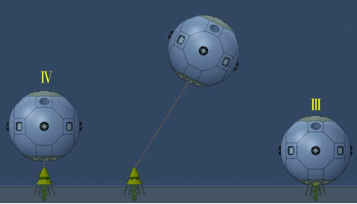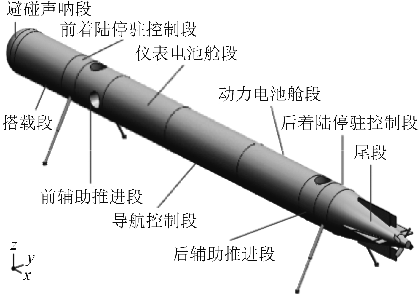 为克服整体着陆的浮力调节无人潜航器长期驻留后易被海底泥沙掩埋的问题,其技术演进为采用支撑机构的新型海床驻留形式。宋保维等[4 - 31]提出了一种液压支撑式海底驻留的方法,即在AUV的前后分别设置一个液压支撑段,每个液压支撑段可在海底驻留时通过液压机构释放出2个支撑杆。AUV首先在预定作业地点通过声呐寻找较为平坦的区域,在该区域航行到距离海底5m左右高度,通过垂直推进器辅助实现悬停,并伸出液压腿。随后压载水舱进水,使航行器负浮力增大实现着陆。在任务结束后,重新调整航行器为悬浮状态,在该状态下收回支撑杆后,可执行后续任务。液压支撑杆驻留航行器组成见图8。