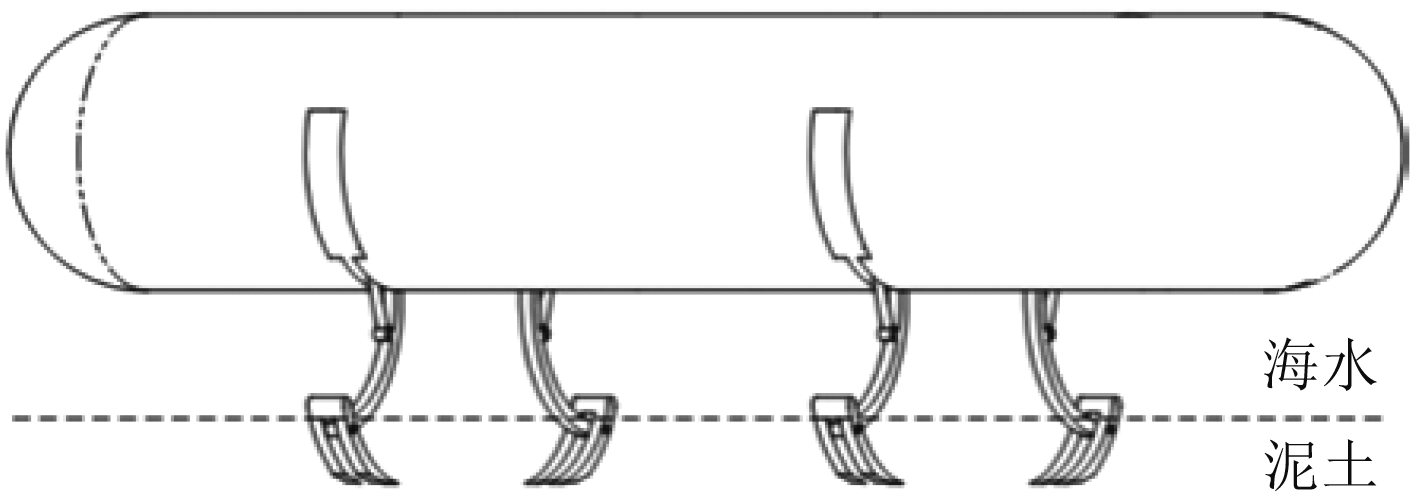 徐健等[32]发明了一种海底驻留的锚泊装置及方法,该装置由液压驱动臂、可收放锚杆和抓泥铲组成(见图9)。在航行过程中,抓泥铲等组件可贴合在航行体表面,不破坏航行体整体流线外形。在需要驻留时,由液压驱动臂驱动锚杆,使抓泥铲嵌入海床,实现驻留。驻留—航行转换时,收缩液压驱动臂,使抓泥铲从海床拔出,实现向自由航行状态转换。该嵌入式锚泊方式解决了液压支撑式和锚链式驻留会使UUV受到海流干扰漂离坐底位置的问题。