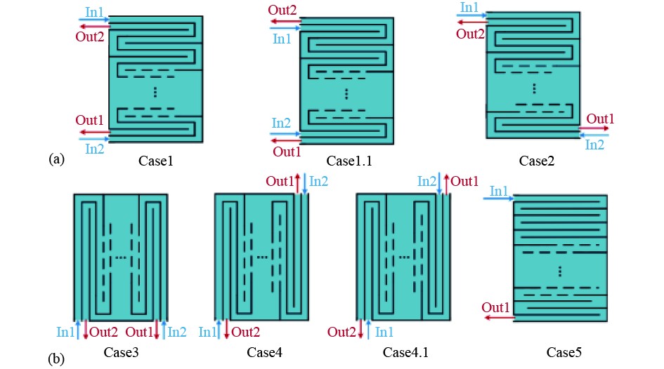 图 3 蛇形通道出入口不同位置的示意图 Fig. 3 Schematic of serpentine channel with different inlet and outlet positions |