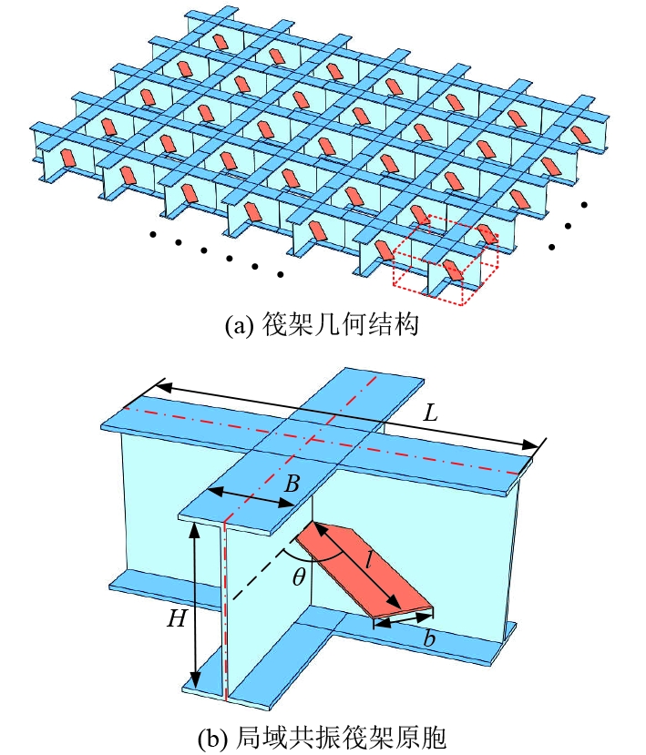 1 局域共振筏架模型及带隙分析理论 1.1 局域共振型筏架模型简介如图1所示,局域共振筏架以框架式筏架为基础,其主体为H型钢,在H型钢腹板中间设置悬臂结构从而建立局域共振单元。局域共振筏架中的最小重复单元为原胞,如图1(b)所示。局域共振筏架原胞边长为L=0.7m,高度为H=0.35 m,悬臂结构长度为l=0.5 m,宽度为b=0.1 m,厚度为t=0.005 m,悬臂结构偏置角θ=45°。局域共振筏架的材料为钢,密度为ρ=