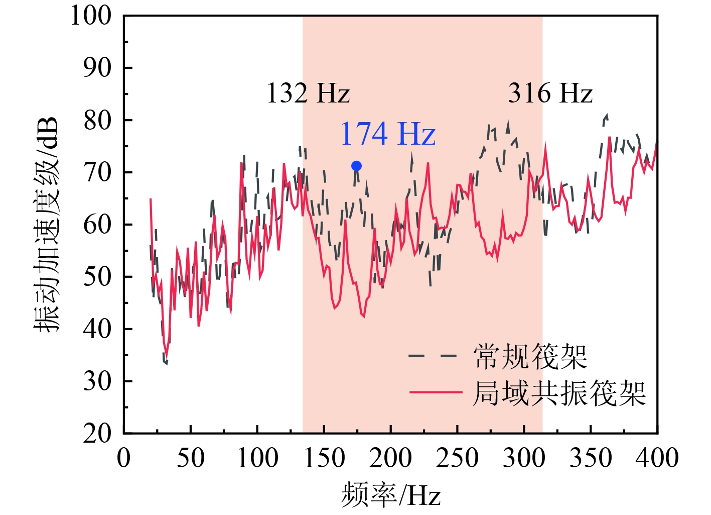 在外部载荷激励下,筏架结构产生振动并传递至舱段外壳体。安置了常规筏架和局域共振筏架的舱段表面考核点的振动响应对比如图10所示,振动加速度级参考值取a0=1×10−6 m/s2。