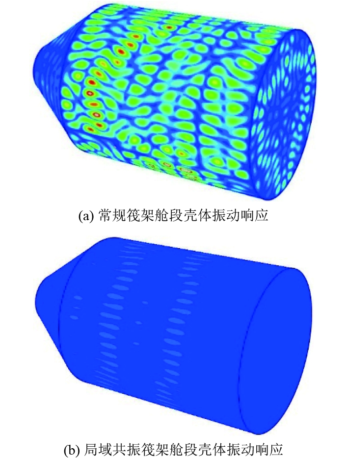 在相同外部载荷激励下,采取局域共振筏架与常规筏架的尾部舱段外壳振动加速度级曲线整体呈现出波动上升的相似变化趋势,但在132~316 Hz频段带隙的减振效应安置了局域共振筏架的尾部壳体响应显著降低。结合图11所示的174 Hz频率下含有不同筏架的壳体振动响应分布情况同样可知,在相同响应限值下,安置了局域共振筏架的尾部舱段壳体高响应区域较常规筏架舱段显著减少,常规筏架舱段壳体最大振动响应为84.3 dB,而局域共振筏架舱段壳体最大振动响应仅为63.5 dB。