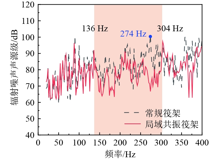 在136~304 Hz频段内局域共振筏架舱段噪声明显低于常规筏架舱段。该频段内常规筏架舱段水下辐射声源级总级为108.4 dB,而安置了局域共振筏架的舱段水下辐射噪声声源级总级为102.5 dB,噪声降低5.9 dB。同时也不难发现,噪声抑制频率范围与振动降低的频率区间基本一致,其均是由于局域共振筏架的带隙效应导致的。