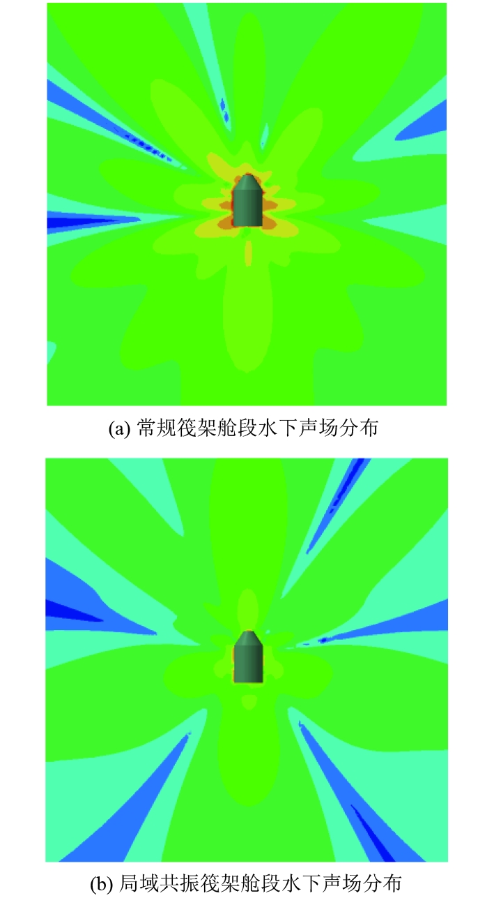 图13所示为274 Hz频率下不同筏架尾部舱段声场分布特性。安置了2种筏架的尾部舱段声压云图均呈现出了蝶形对称特征,在相同声压限值下,局域共振筏架舱段高声压区域较常规筏架舱段显著减少,抑制了噪声传播具有明显的降噪效果。