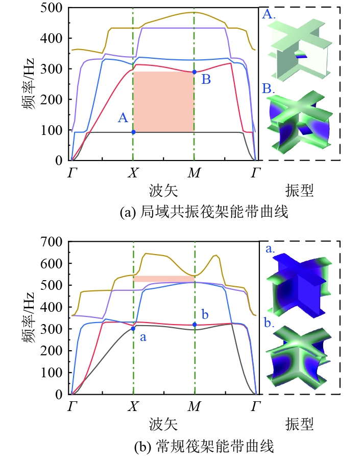 基于有限元方法计算得到局域共振筏架和未设置悬臂结构的常规筏架原胞的前5条能带结构曲线,其中3条能带自Γ点出发,分别对应弯曲波、纵波和横波模态。从图3(a)中可知,局域共振筏架的第一能带为平直带,且第一能带和第二能带之间存在X-M方向的局域共振带隙,带宽为197.3 Hz。局域共振带隙是由于筏架附加悬臂结构的强共振特性导致的。A点对应的模态振型中仅存在悬臂结构的局部共振,这意味着局域共振带隙的开始,则带隙起始频率为92.1 Hz,而B点处展现的原胞整体振动模式代表了局域共振带隙的结束,带隙截止频率为289.4 Hz。