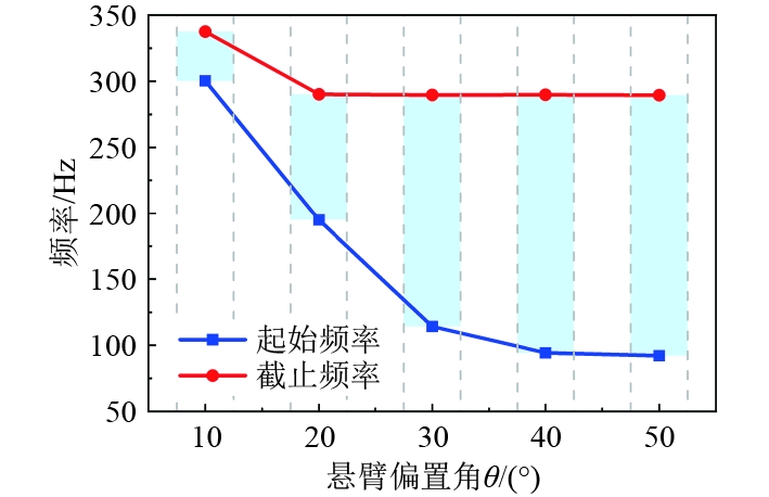 图 4 悬臂偏置角对带隙特性的影响 Fig. 4 Effect of cantilever offset angle on bandgap characteristics |