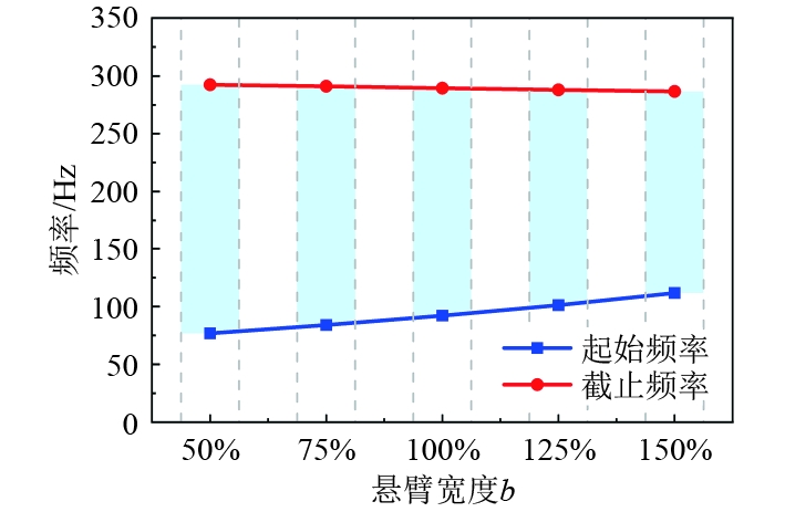 图 6 悬臂宽度对带隙特性的影响 Fig. 6 Effect of cantilever width on bandgap characteristics |