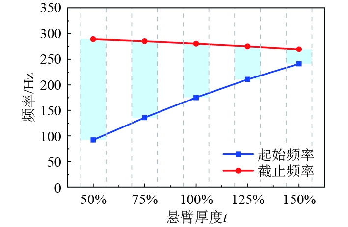 图 7 悬臂厚度对带隙特性的影响 Fig. 7 Effect of cantilever thickness on bandgap characteristics |