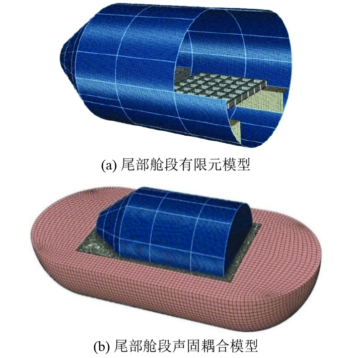 为保证计算精度,结构网格划分应满足单位波长内至少包含6个单元[17]。在20~400 Hz计算频段内,采用S4R单元对水下航行器尾部舱段结构进行网格划分,单元尺寸为0.075 m,网格总计