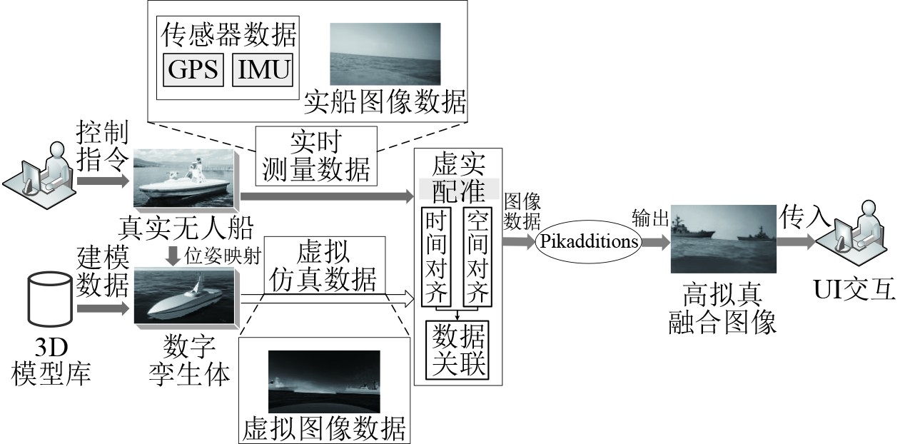 系统核心部分包含真实无人船、无人船数字孪生体、虚实配准模块、Pikadditions模块以及UI交互模块。其中,真实无人船的船身搭载了多源传感器与成像设备,便于实时采集无人船的航行信息。无人船数字孪生体基于3D模型库构建而成,用于在仿真环境中模拟实船的运动状态。虚实配准模块是对真实场景图像与虚拟仿真元素进行无缝合成,实质是将虚实无人船的姿态进行对齐[16]。Pikadditions模块通过对虚实图像进行融合处理,从而将虚拟元素自然迁移到实际场景图像中。UI交互模块作为系统与用户进行数据交互的桥梁,一方面将用户输入数据传输至实船,另一方面将Pikadditions合成的图像返回给用户以便进行后续处理。