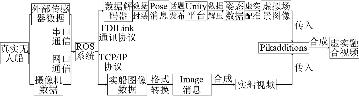 1.2 系统数据传输机制无人船视觉场景虚实融合系统的数据处理与传输涉及多个软硬件平台的协同工作,如图2所示。各模块协同联动,确保系统稳定高效运行。