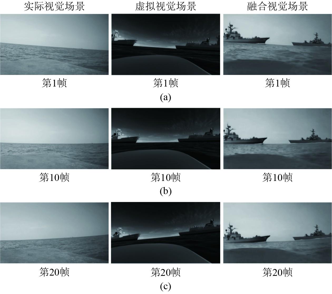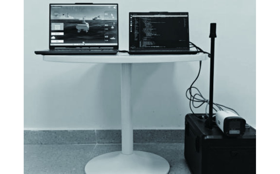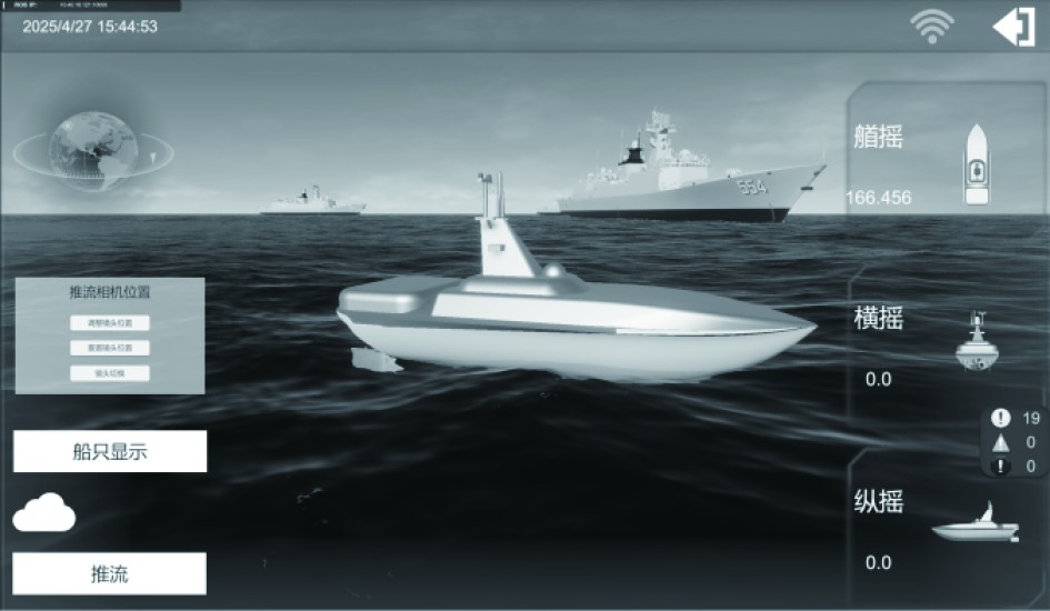 3.2 实验验证本系统通过有线接口将传感器和摄像设备获取的实船多源数据同步传输至上位机,并利用ROS系统中的节点对图像和姿态数据进行预处理。经过预处理后的实船数据随后以25帧/s的帧率传输至Unity平台。为确保数字孪生体与实船的时空一致性,系统基于ROS的时间戳机制,对多源异构数据进行时间同步;通过对虚拟空间坐标系进行动态转换及虚实图像海天线对齐,实现虚拟空间与真实空间的高精度匹配,并将时空同步后对应生成的虚拟图像传入Pika平台。