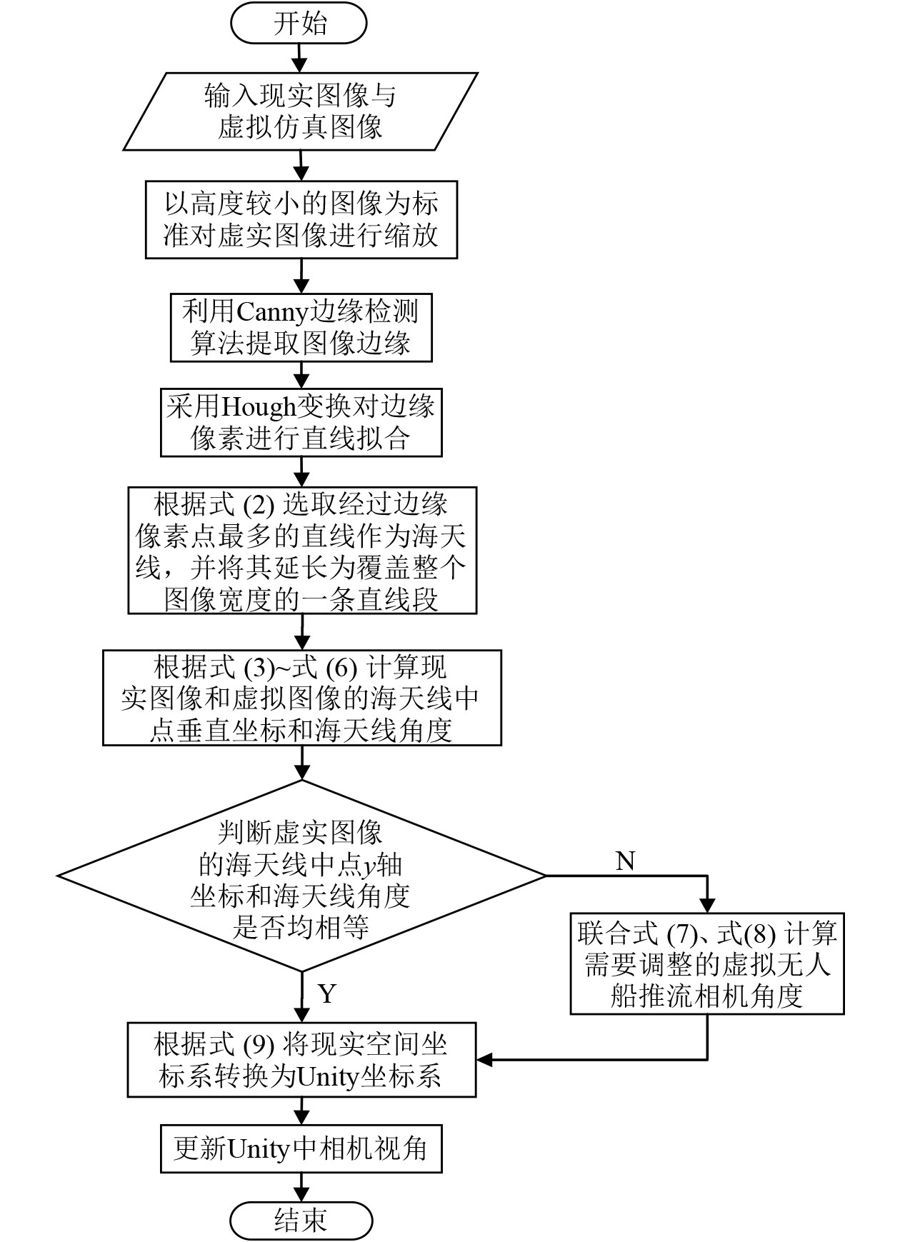 2.3 虚实数据时空对齐首先,ROS系统从船载设备实时获取姿态信息与图像数据,再将所有原始数据进行统一的时间戳标定与标准化消息封装,随后发布至特定话题通道,这是虚实无人船时间同步的关键步骤。接着,Unity平台通过订阅ROS发布的相关话题实时获取实船的运动状态数据,并将数据动态映射至数字孪生体模型中,驱动其在仿真环境中的姿态变换。最后,为进一步提升虚实空间的一致性,Unity平台不仅以现实坐标系为标准变换虚拟空间坐标系,还通过检测虚实图像海天线角度偏差进一步调整虚拟无人船推流相机的角度,以实现虚实无人船的姿态对齐。虚实图像的空间对齐算法流程图如图5所示。