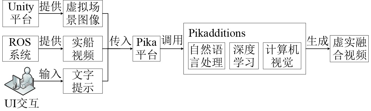 在无人船视觉场景虚实融合系统中,Pika平台先同时接收来自Unity平台的虚拟图像数据、来自ROS系统的实船视频以及用户输入的文本提示,然后调用Pikadditions功能对传入数据进行融合处理,如图6所示。具体处理过程如下:首先Pikadditions结合自然语言处理技术对用户输入的文本提示进行语义解析,提取出将虚拟场景元素迁移至实船视频且保持较高真实感的操作指令。接着利用卷积神经网络和自注意力机制,对视频中的各个帧进行语义分割、特征提取和运动轨迹分析,从而定位出适合插入虚拟元素的位置和角度。最后通过图像生成技术,对拼接图像进行风格匹配和特征映射,确保其在色调、光影、透视以及运动连贯性等方面与原视频完美融合,从而生成视觉效果自然的虚实融合视频,能够比较真实地反映无人船在动态海洋环境中的运动过程及其与周围环境的交互特征,有效提升了虚实融合系统的真实感与一致性。