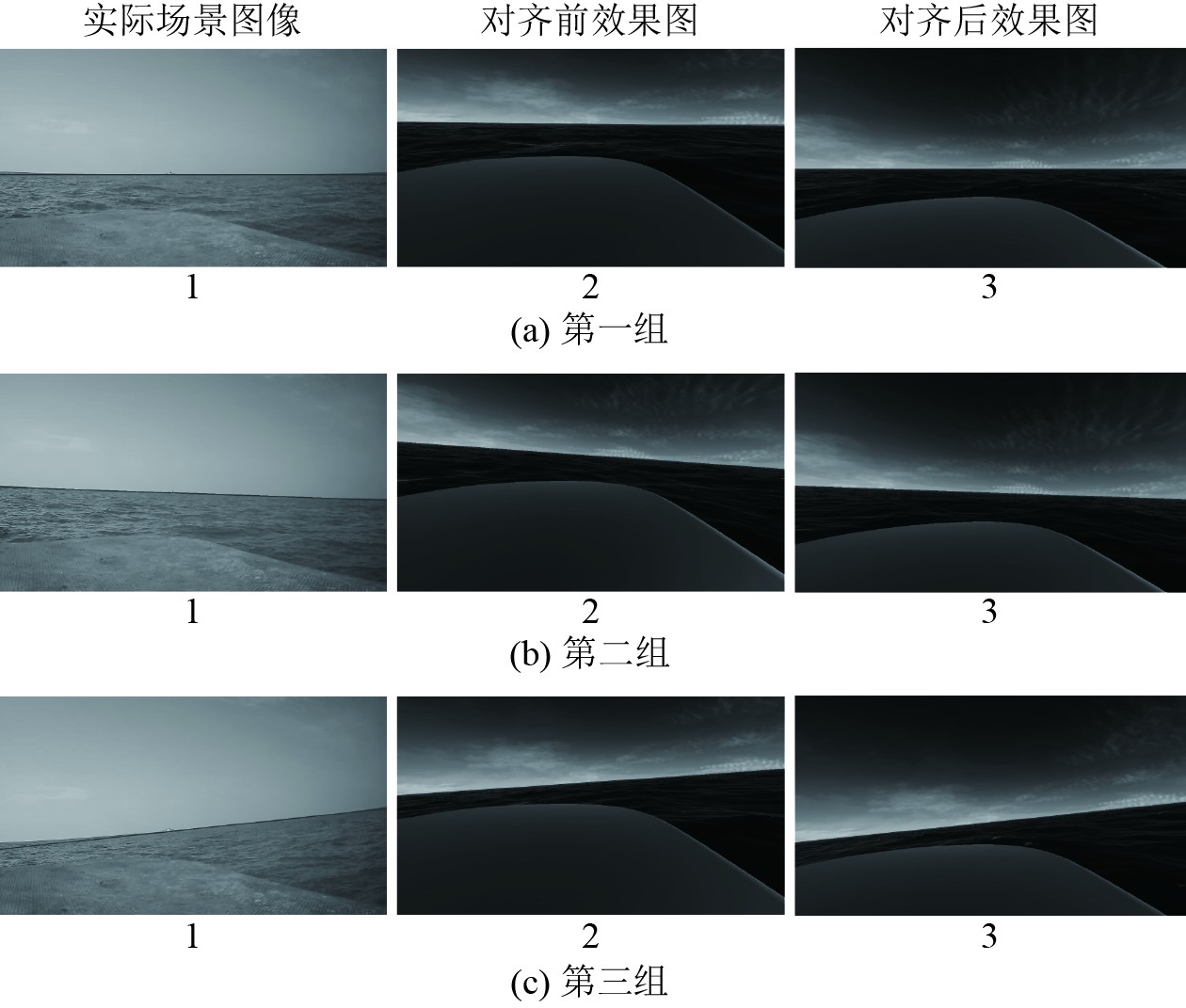 图8为4组虚实图像海天线对齐前后的效果,如图8(c)第2张计算得到虚拟无人船推流相机调整前的俯仰角偏差为−11.86°,横滚角偏差为−2.00°,由于俯仰与横滚角度偏差均较大,故认为虚实无人船姿态未对齐,根据偏差角度对虚拟无人船推流相机角度进行相应调整后,再次计算图8(c)第3张的推流相机俯仰角偏差为−1.67°,横滚角偏差为−0.04°,由于推流相机俯仰角偏差与横滚角偏差与调整前相比均已减小,且偏差值较小,故认为调整后的虚实空间已实现对齐。