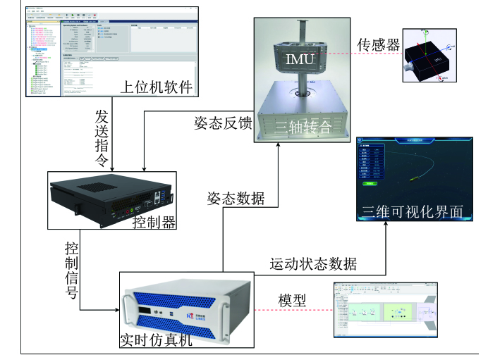 4)三轴转台。物理复现UUV姿态,其中搭载IMU传感器,实时测量转台姿态角、角速度并输出数据至控制器;