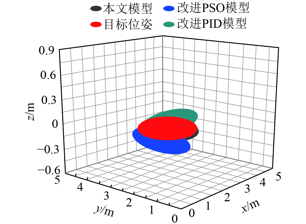 通过图3可知,经本文模型对实验AUV的流体结构件进行三维控制后,AUV的实际位姿与目标位姿几乎能够吻合。而2个对比模型控制后,AUV的实际位姿均与目标位姿均存在明显偏差,其中,改进PSO模型表现出的偏差更为显著。
