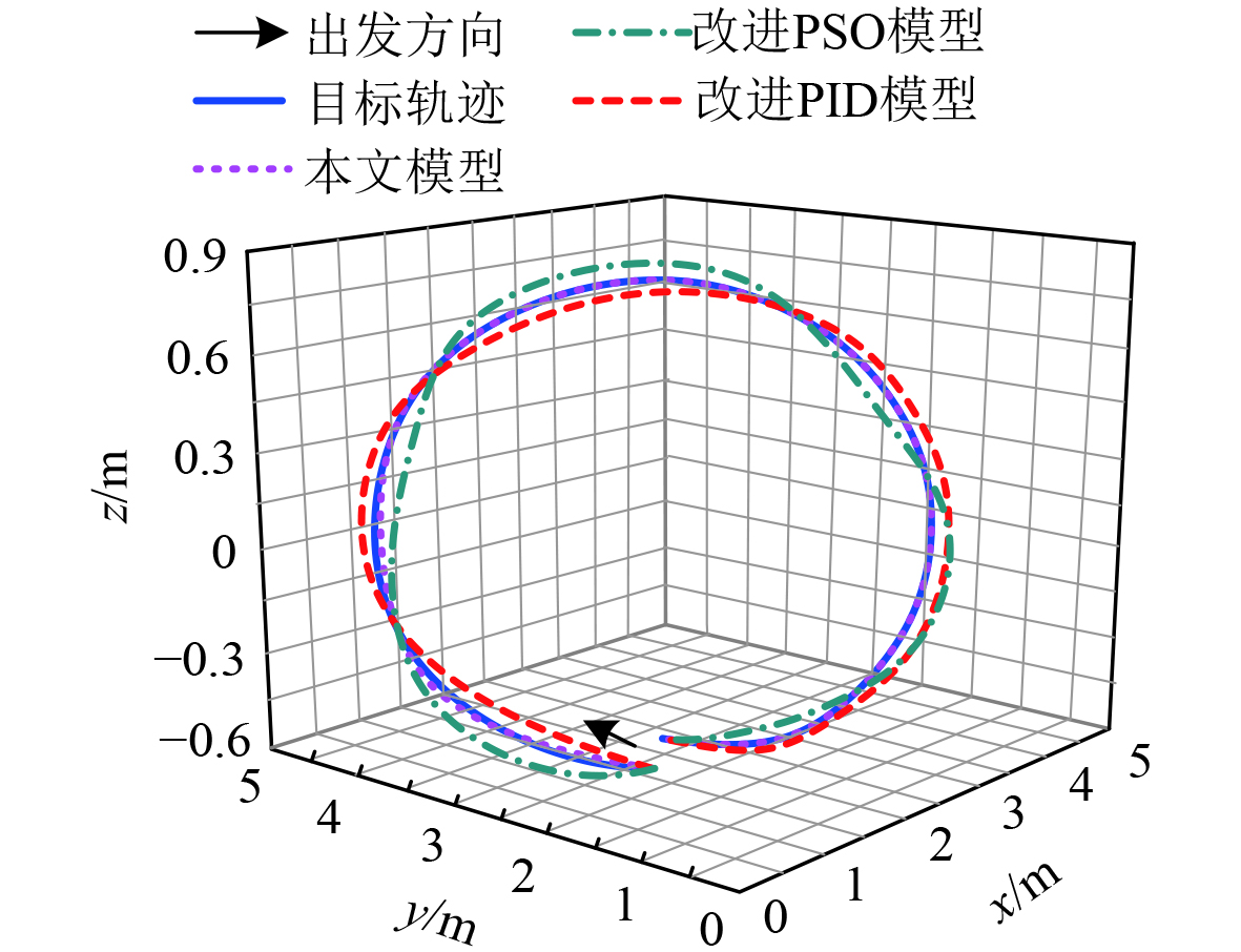 分析可知,2个对比模型控制后AUV的圆形跟踪轨迹与目标轨迹存在显著偏差,尤其在圆形转弯位置更为明显。而本文模型控制后,AUV的圆形跟踪轨迹仅在刚出发时存在微小偏差,几乎可忽略不计,后续可快速跟踪上目标轨迹,且在圆形轨迹曲率变化最大的转弯区域,仍能保持轨迹平滑且无超调。这是因改进PID控制模型通过前馈补偿抵消了扰动,降低了对控制器反馈增益的依赖,允许使用更大的控制步长,确保了AUV在复杂机动中仍能表现出优异的动态跟踪品质与航向稳定性。但是改进PID控制模型包含多个自适应与观测模块,其算法结构更为复杂,在计算资源极其受限的微小型水下机器人平台上,需要提前精简模糊规则库或降低状态观测器的维数,即存在对计算资源的要求这一局限。