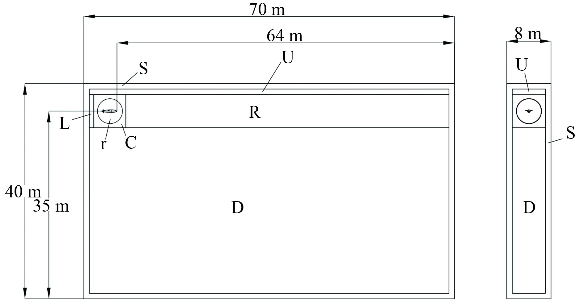 DEMIRDŽIĆ等[14]对中计算域的选择方法,进行多次数值计算验证,将计算域设定为70 m×40 m×8 m。考虑到水下滑翔机具有对称性结构,本文仅研究其在X、Y方向的平动以及绕Z轴的旋转运动,将计算域划分为7个子区域,具体划分方式如图4所示。其中几何对象被包裹在旋转域Fluid_r中,旋转域跟随滑翔机进行主动运动,其余的Fluid_C、Fluid_L、Fluid_R、Fluid_U、Fluid_D通过对其施加求解出的滑翔机的速度进行平动,剩下的Fluid_s为静止域。这些流体域的运动方式见表2。