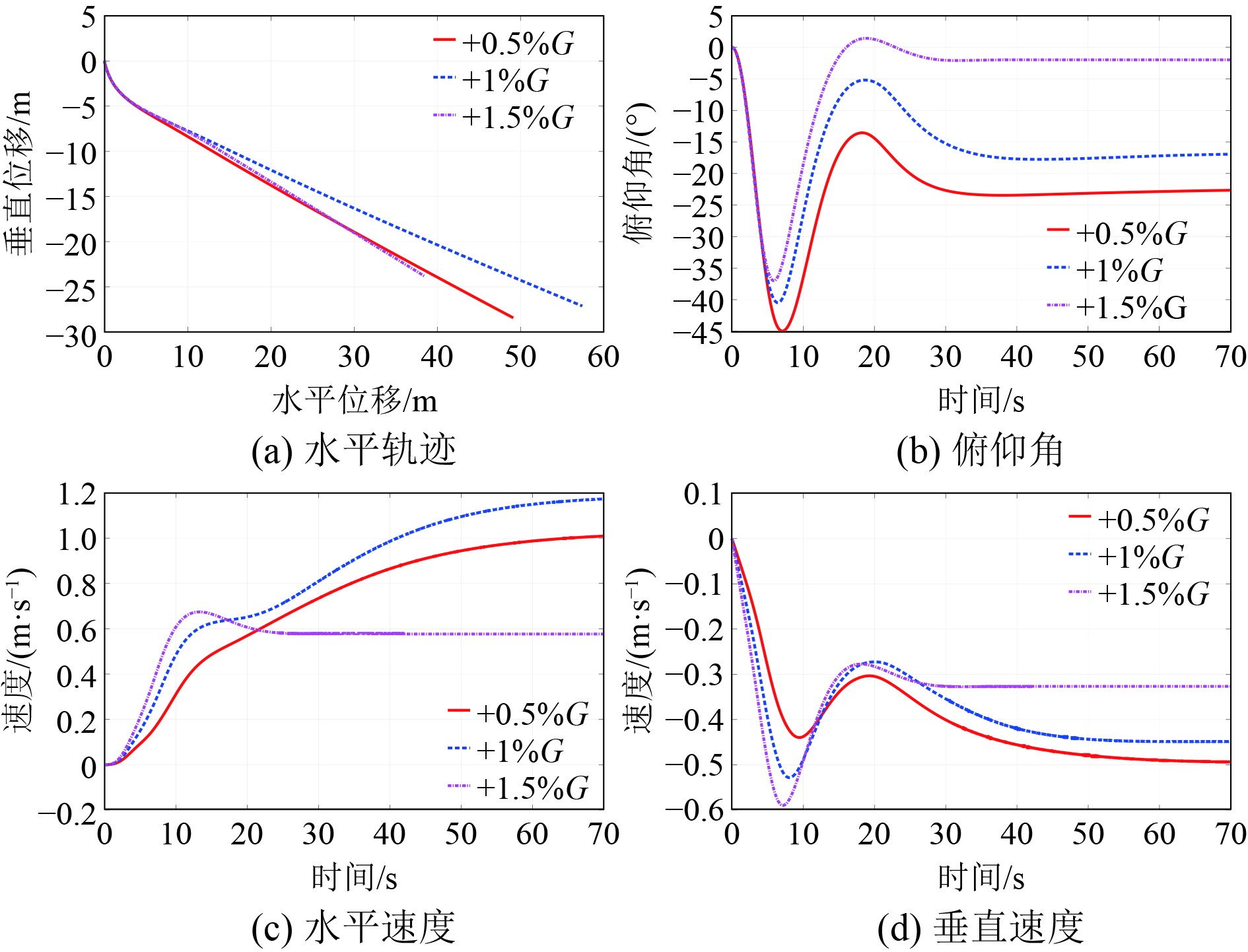 表 8 重心前移0.2%L下重力增加0.5%G~1.5%G仿真结果 Tab.8 Simulation results of 0.5%G~1.5%G gravity increase with center of gravity moved forward by 0.2%L |