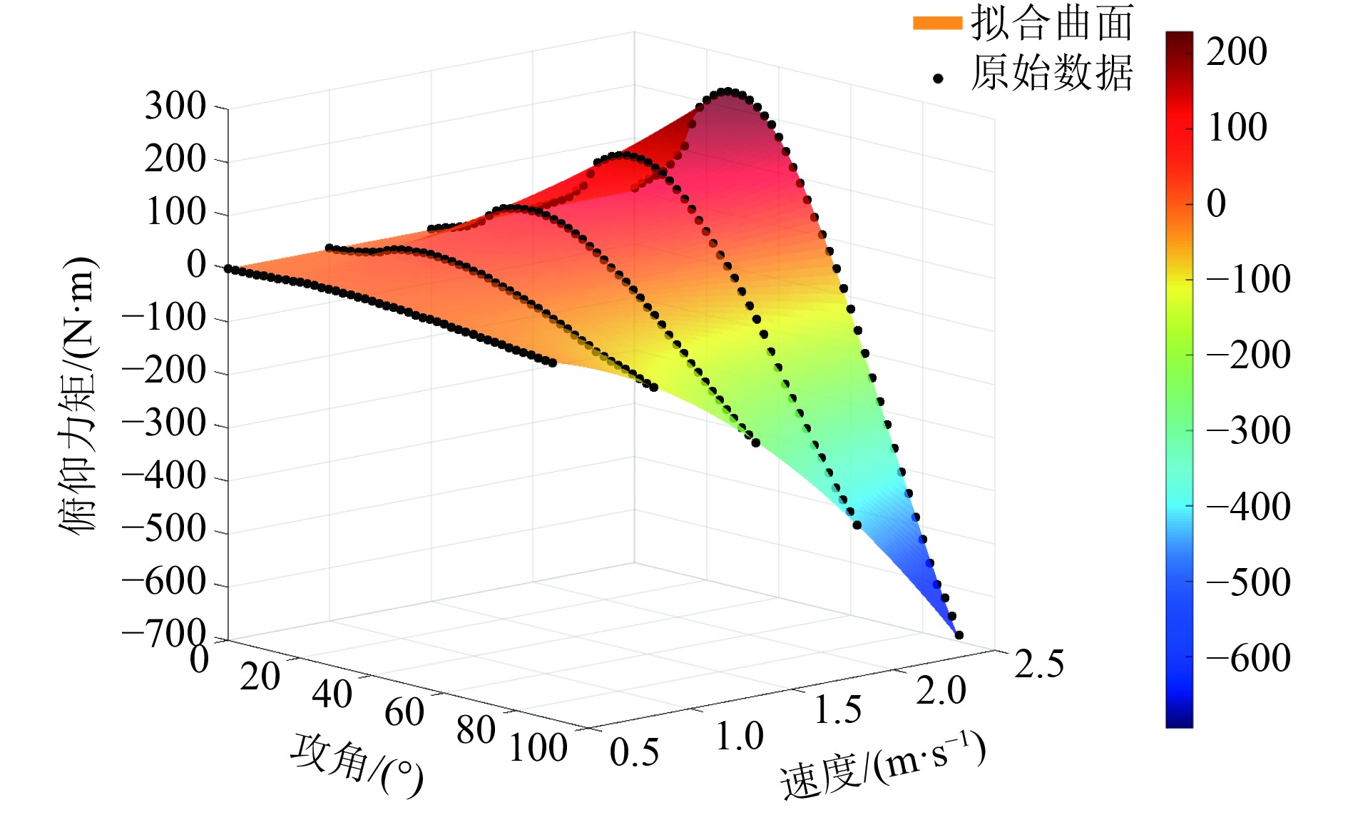 首先,基于滑翔机动力学特性,选取典型工况下的仿真数据(涵盖速度0.5~2.5m/s与攻角范围0~90°),采用最小二乘法拟合俯仰力矩Mz与速度U、攻角
