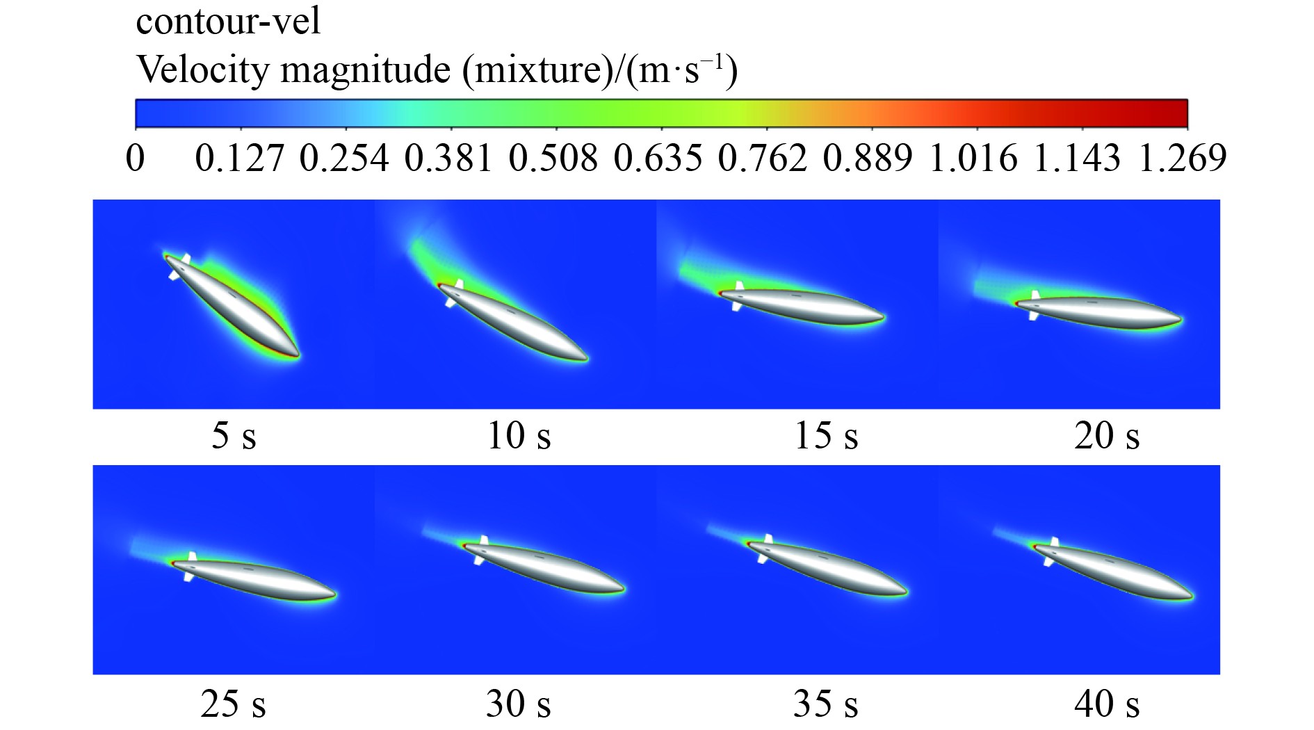 对该最优工况(重浮力差1.2%G、重心前移0.2%L)进行力矩验证:预测流体动力矩(8.25 N·m)与自身力矩(9.61 N·m)差值−1.36 N·m,差值较小,力矩基本平衡,确保姿态稳定。图9给出了该工况下的速度分布云图,可见滑翔机周围流场平稳,无明显分离现象,进一步验证了该工况的合理性。