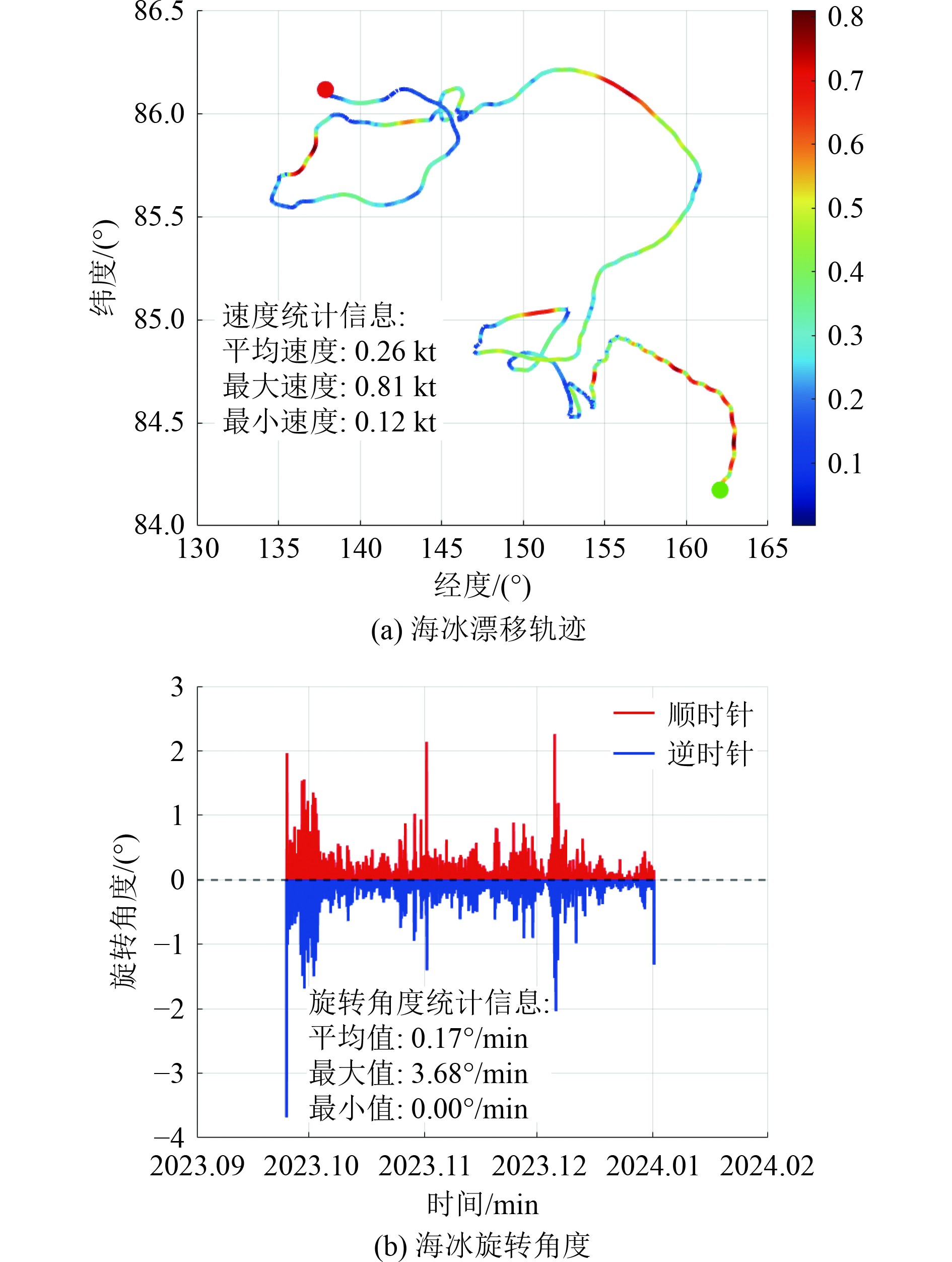 1 海冰漂流数据处理为获取海冰的运动状态信息,本文基于在北极部署的冰基浮标真实漂流数据,计算出观测期间的海冰最大、最小和平均漂移速度,通过计算2个浮标位置向量在连续时间点的方向角变化,求出段间旋转角度,并累计以反映海冰的整体旋转趋势,为仿真提供数据支持。从2023年9月25日年到2024年1月1日的海冰漂移轨迹数据处理结果如图1所示。