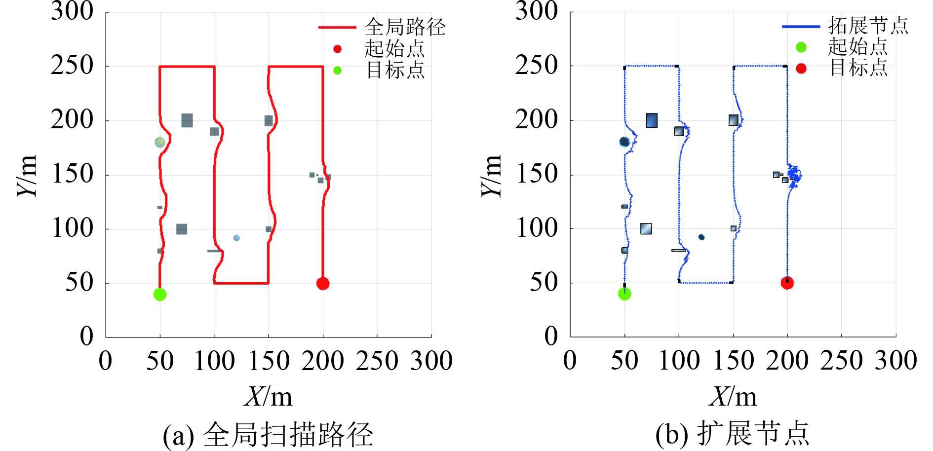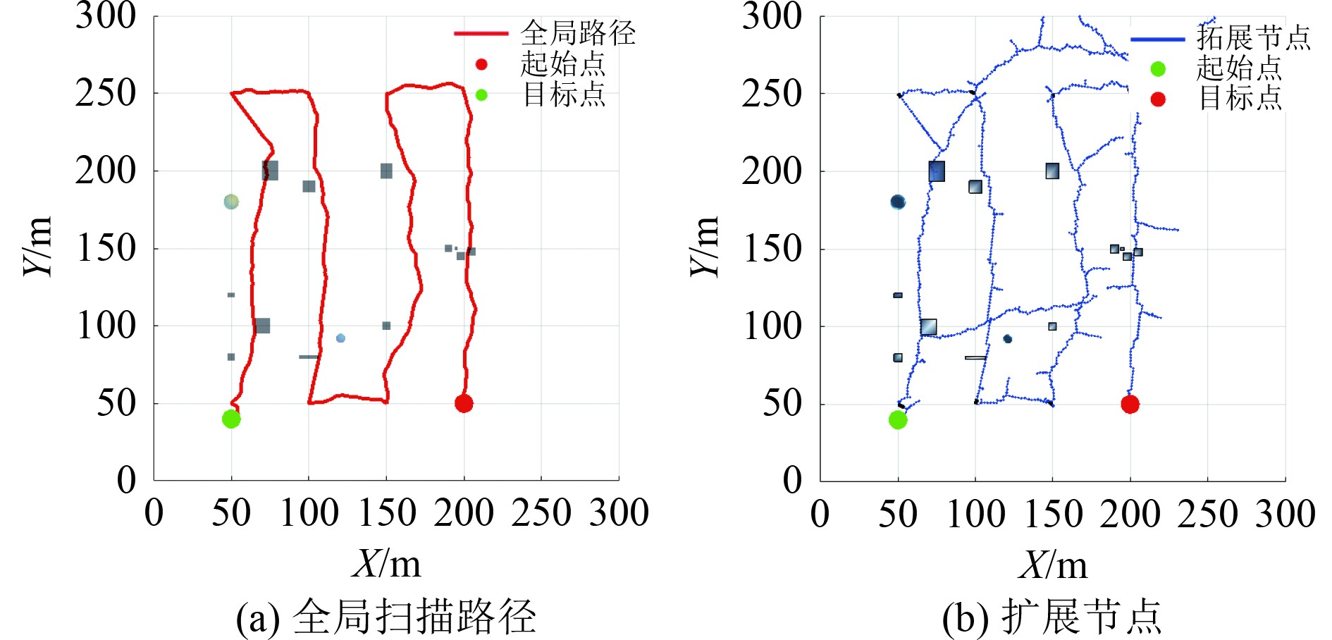 在300 m×300 m×160 m的网格地图中对2种算法进行对比,起始点坐标为[50,40,140],终点坐标为[200,50,140],蓝线表示搜索过程,红线表示生成的全局扫描路径,图中长方体和球体表示障碍物。为避免单次测试的偶然性,对2种算法进行10次测试,测试的平均值如表1所示。通过扩展方向的优化,扩展节点的数量减少了31.00%,除去不可覆盖的区域,扫描覆盖率增加了11.20%,规划时间减少了22.02%,路径长度减少了3.80%。综上所述,改进RRT*算法在关键指标上表现出显著优势。传统的RRT*算法生成的全局扫描路径和扩展节点如图10所示,改进后的效果如图11所示。