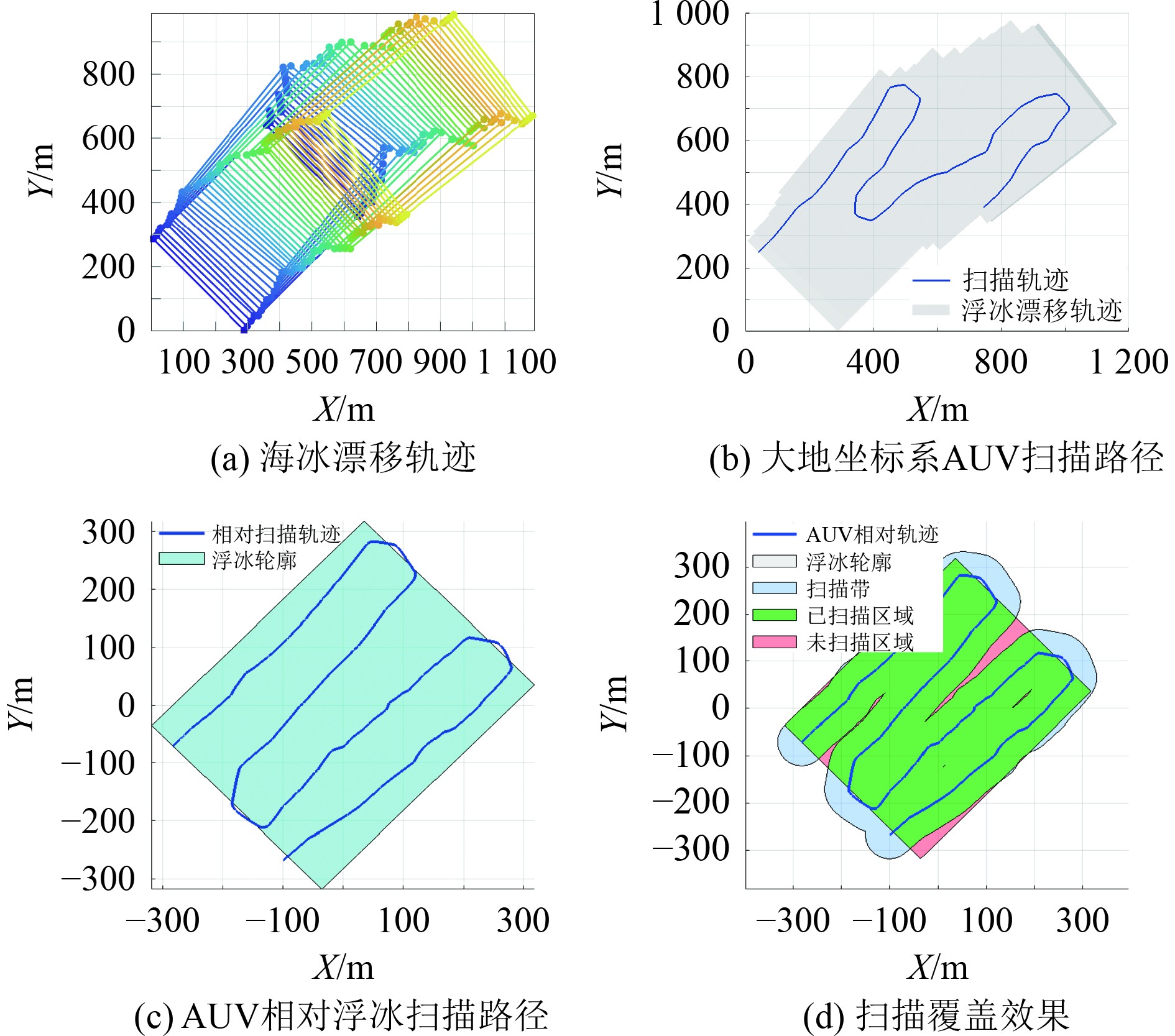 选取尺寸为400 m×500 m 的漂移海冰作为扫描对象,对融合算法进行仿真验证,仿真结果如图14所示。海冰在实际环境中的漂移预测轨迹如图14(a)所示,不同颜色区域代表GPR算法预测的每分钟浮冰位置。基于预测位置,采用改进RRT*与改进的DWA算法对整个目标区域进行全域扫描路径规划。AUV在大地坐标系下的扫描路径与海冰的漂移轨迹如图14(b)所示。AUV相对于海冰坐标系下的扫描路径如图14(c)所示。AUV在100 m宽度扫描带下的覆盖情况如图14(d)所示。仿真结果表明,所选海冰的总面积为2×105 m2,AUV实际覆盖的扫描面积为