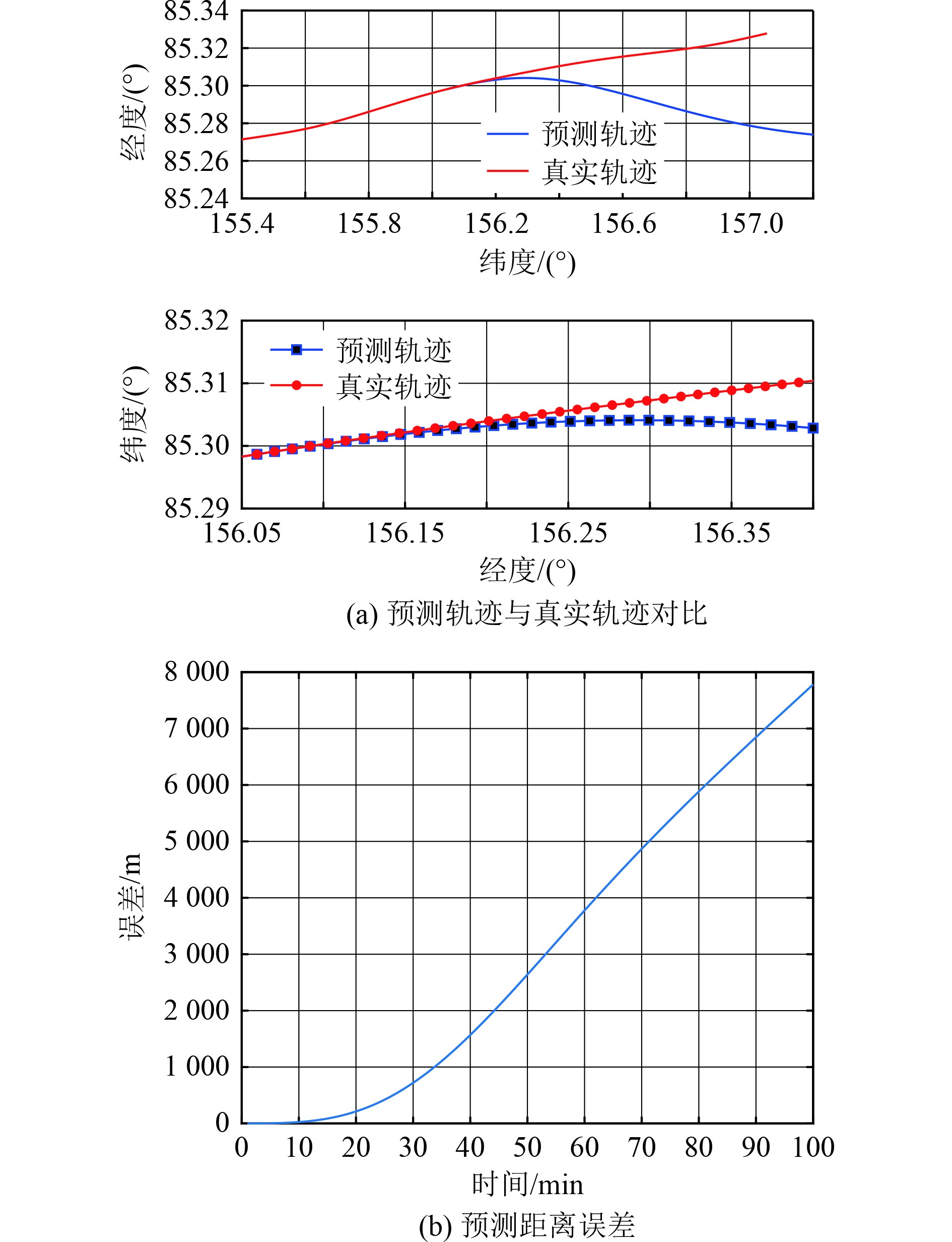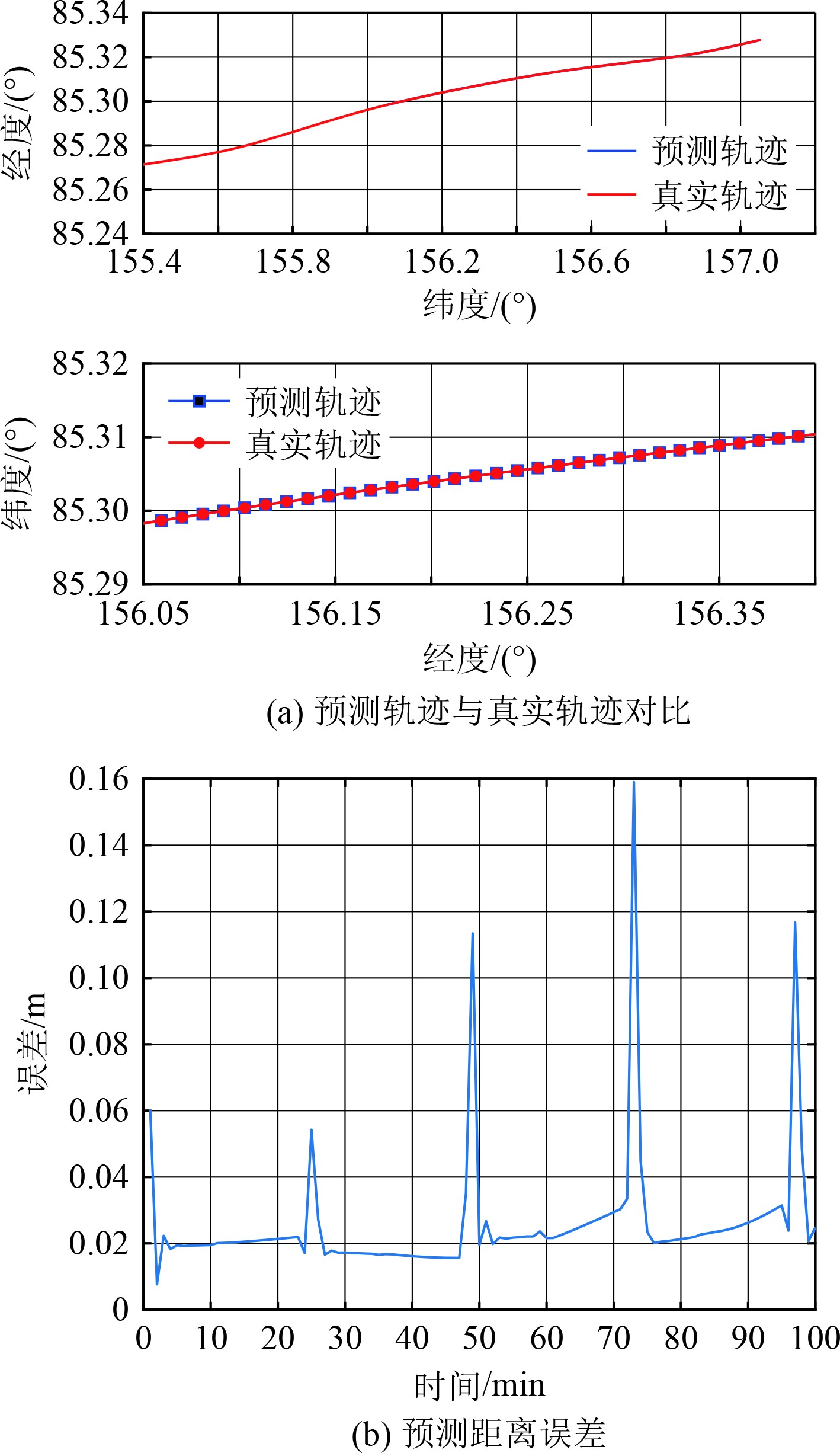 传统GPR预测效果如图2所示,预测误差随着时间的积累逐渐增大,10 min后误差大于20 m,无法满足任务需求。引入真实值校正机制后的预测效果如图3所示,在100 min内,模型1 min间隔的位置预测误差保持在0.16 m内。