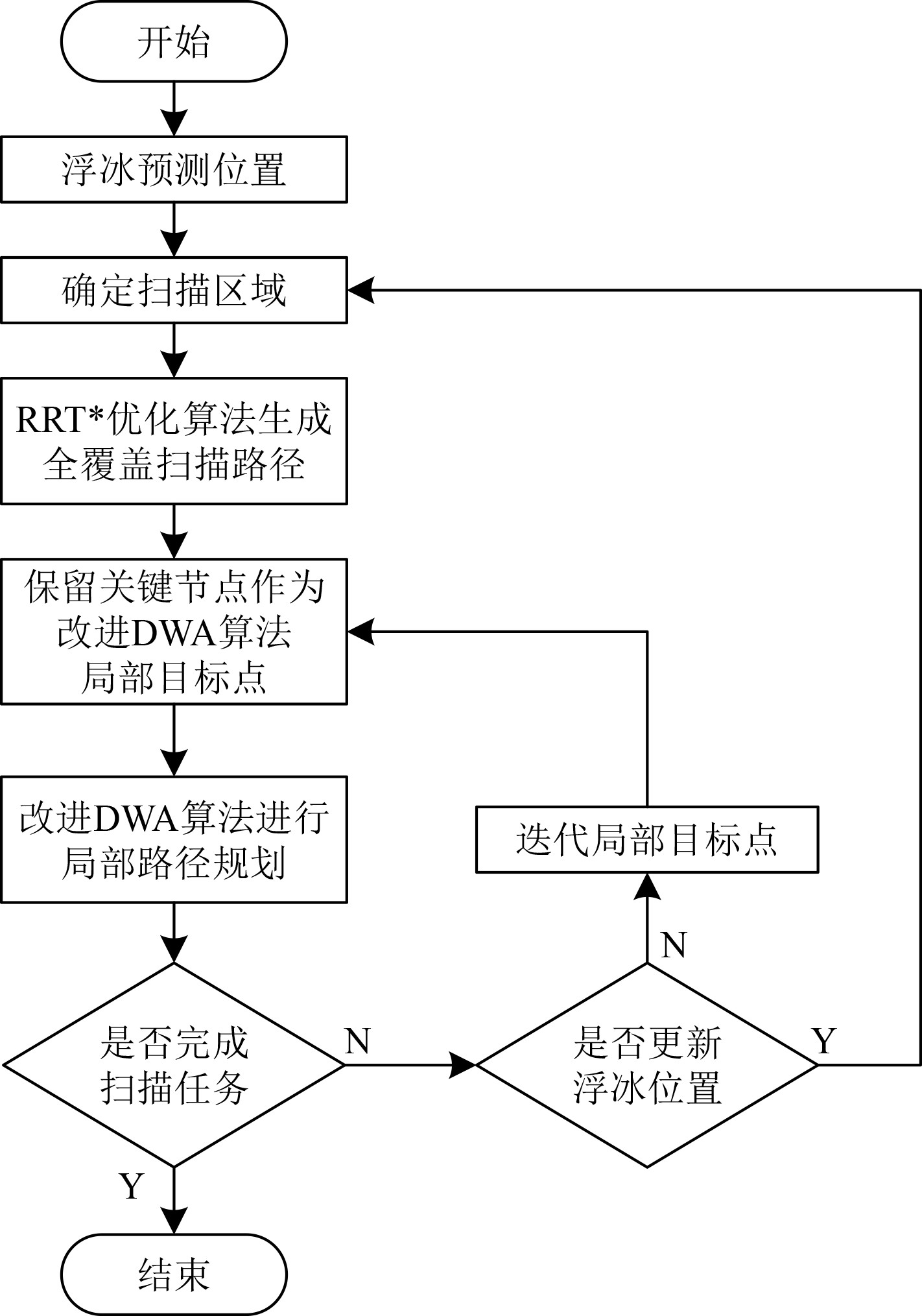 针对AUV算力受限与漂移海冰探测需求之间的矛盾,本文提出一种融合高斯过程回归(Gaussian Process Regression,GPR)与改进快速探索随机树(Rapidly-exploring Random Tree Star,RRT*)和动态窗口法(Dynamic Window Approach,DWA)的三维路径规划方法[14]。该方法首先采用GPR对海冰未来短时轨迹进行预测,然后以预测结果为目标区域,通过改进RRT*算法生成全覆盖路径,实现海冰扫描的全局引导,随后结合改进DWA算法实现全局路径的动态跟踪与局部避障,有效提升AUV在复杂冰下环境中的自主导航能力,实现对漂移海冰目标的高效、连续且全覆盖扫描。