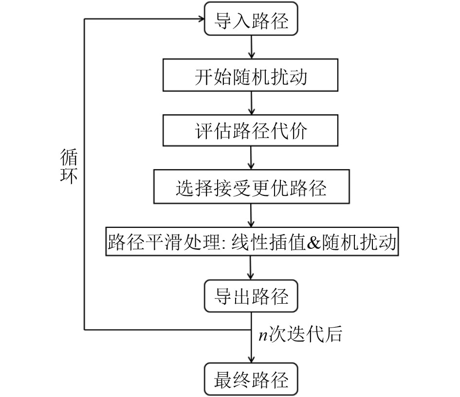 蒙特卡洛方法的流程图如图1所示,此流程图完整展示出路径优化的全过程,该方法借助随机扰动、路径评估、路径接受以及平滑处理等步骤,可于复杂的三维环境里寻得一条相对较优的路径[16]。