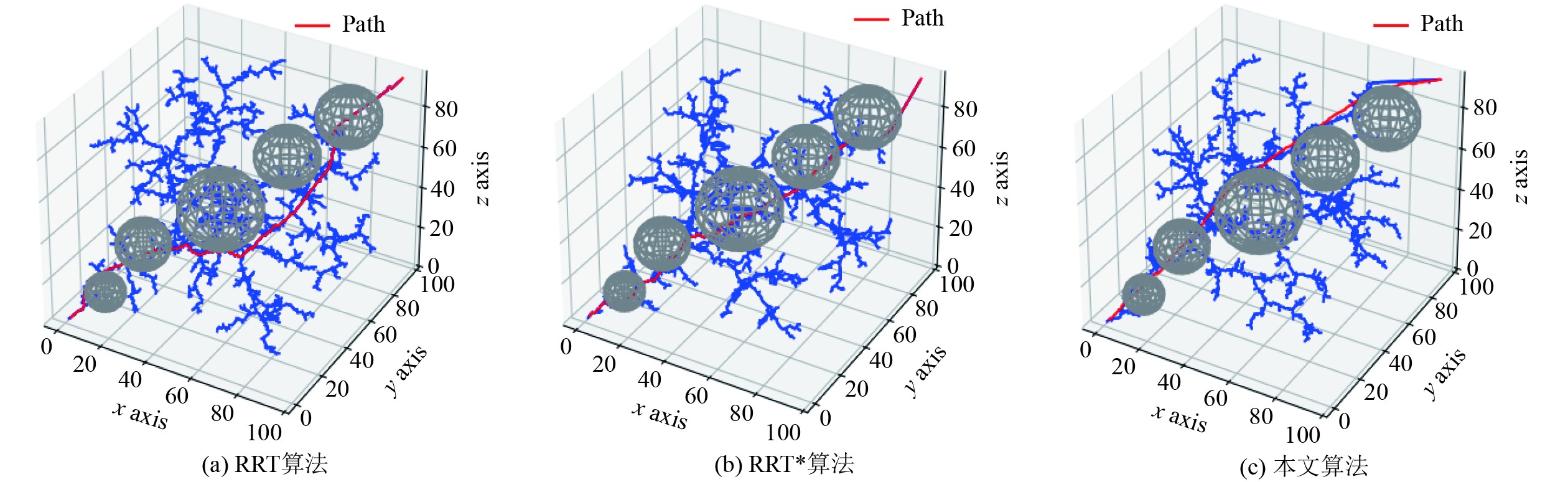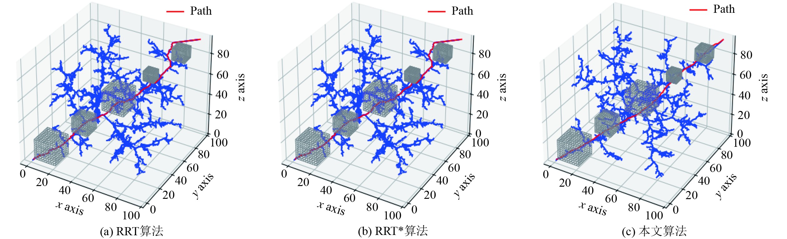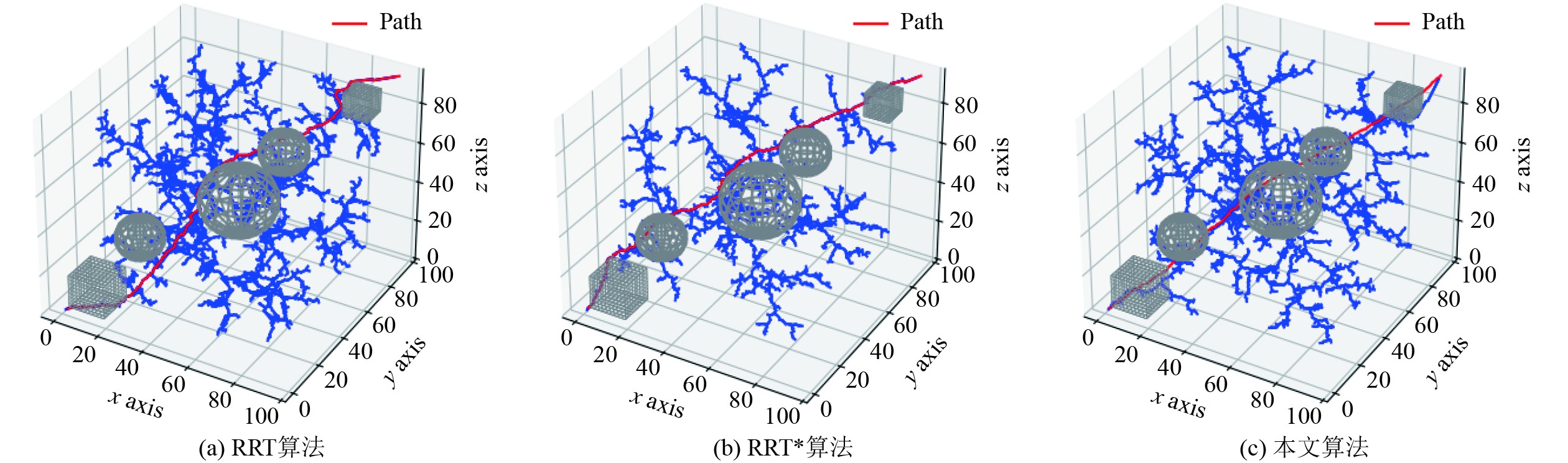 从表1~表3可以得出,经过50次实验的平均路径长度,在障碍环境1中本文算法比RRT算法缩短23.93%,比RRT*算法缩短11.17%,在障碍环境2中本文算法比RRT算法缩短25.13%,比RRT*算法缩短10.66%,在障碍环境3中本文算法比RRT算法缩短24.22%,比RRT*算法缩短10.57%。因此,对比传统的RRT算法,本文算法在三维全局路径规划中生成的路径更优,具有更好的路径质量。