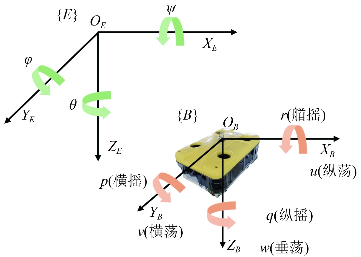 图 1 WHROV的固定坐标系、运动坐标系 Fig. 1 Fixed coordinate system and moving coordinate system of WHROV |