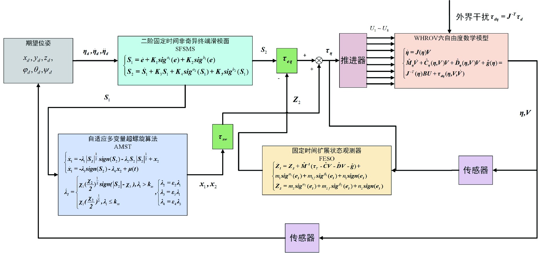 基于上述的式(5)和式(13),本文设计了一种基于固定时间非线性扩展状态观测器的自适应多变量超螺旋二阶滑模控制算法。用于WHROV的轨迹跟踪。本文设计了一种固定时间扩展状态观测器(Fixed-Time Extended State Observer,FESO),估计速度并干扰补偿控制器。同时,设计了二阶固定时间自适应多变量超螺旋滑模控制(Second-Order Fixed-Time Adaptive Multivariable Super-Twisting Sliding Mode Control,SFAMSTSMC),从根源上消除了滑模控制的抖动现象,控制输出平稳。该控制框架如图2所示。