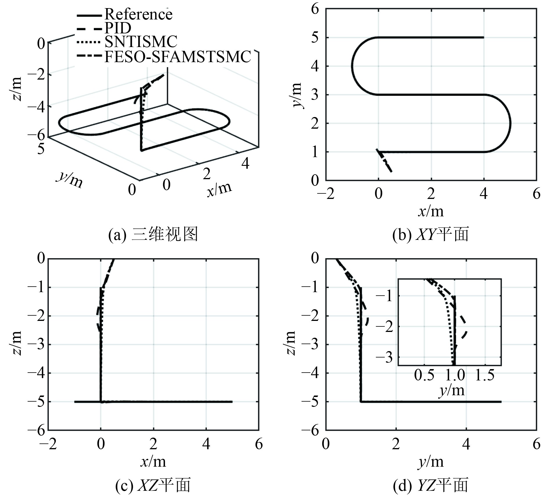 图 4 3种控制方法的轨迹跟踪对比图 Fig. 4 Trajectory tracking comparison of the three control methods |