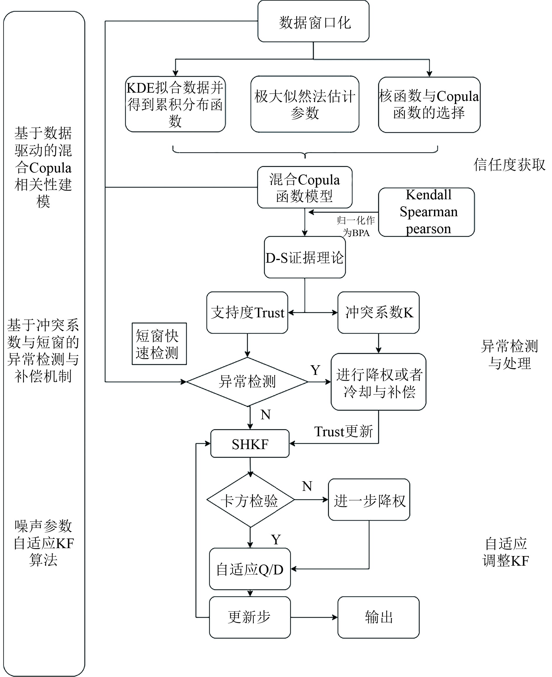 综上所述,现有多源信息融合方法在一定程度上提高了AUV的导航精度和抗噪性能,但大多仍建立在噪声统计特性静态或弱时变的假设之上,这使得 AUV 难以充分适应复杂多变的水下环境[22]。当环境变化或传感器出现异常,导致观测数据之间的相关关系被破坏、冲突信息频繁出现时,现有方法往往难以及时、有效地识别并量化各信息源观测的可靠性,现有方法多通过直接剔除异常数据或被动调整噪声协方差来缓解问题,既难以合理利用异常数据中仍然蕴含的有效信息,又容易导致权重分配失衡,甚至引发滤波增益异常和估计发散,从而严重制约融合算法的精度与鲁棒性。为此,本文提出了一种基于混合 Copula 函数与D-S证据理论的自适应卡尔曼多级融合方法算法流程图见图1。通过将数据层算法与决策层算法相结合,一方面充分利用数据端信息的完整性,另一方面兼顾决策端的鲁棒性与可解释性[23]。