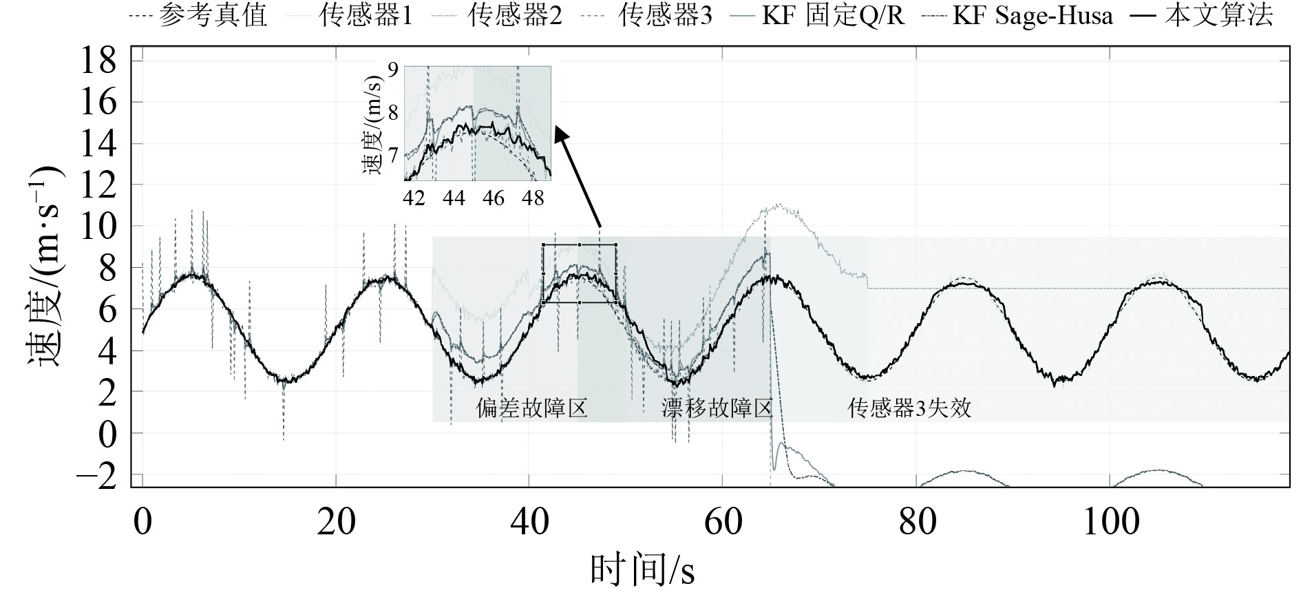 在模拟异常情况下,本算法将Sage-Husa KF和固定Q/R的KF算法运行结果进行对比验证。本文所选取的数据窗口为60个样本点,短窗为8个样本点。仿真数据由3路携带低频干扰和标准差为0.12的高斯白噪声的数据构成,并且,在前30 s内,传感器3(S3)一直存在±3 m/s的脉冲干扰,以此模拟瞬时突变,在30~40 s内,对传感器1(S1)注入+3 m/s的固定偏差,在40~50 s内偏差减小到1.5 m/s,同时传感器2(S2)在45~75 s内出现从0线性增长到5 m/s的漂移量,75 s以后速度观测卡死在7 m/s,此时传感器1偏差停止,传感器3失去信号。在仿真实验中,偏差阈值设置为1 m/s,这个阈值在当前仿真环境下高于噪声,但显著低于故障偏差。漂移斜率阈值设置为0.02 m/s,在本次仿真条件的数量级下一旦漂移存在,短时间内就会跨过该阈值。
