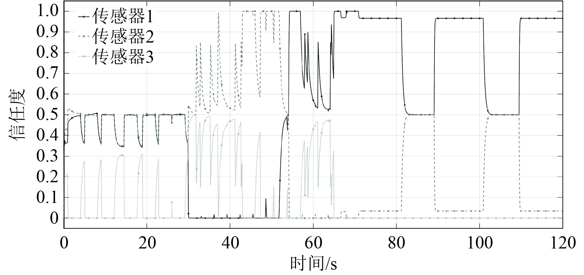 图4中深灰色的圆点实现表示传感器的信任度,中灰色方块虚线和线灰色三角点线分别表示仿真实验下S2和S3的信任度。可以看出,最终权重很好的对异常的传感器进行了降权,在第二阶段,S1权重基本为0,S3存在脉冲,因此第一阶段S2主导;在第二阶段,S2的权重急速下降,S3权重有所上升;在第三阶段,S2与S3两者权重极低,由于S2还是有数据输出,因此S2的权重要高于S3,并且由于S1的数值会变化至S2卡死数值附近,因此会出现权重交叉,这也说明这个权重很好的反映了各传感器之间的状态。