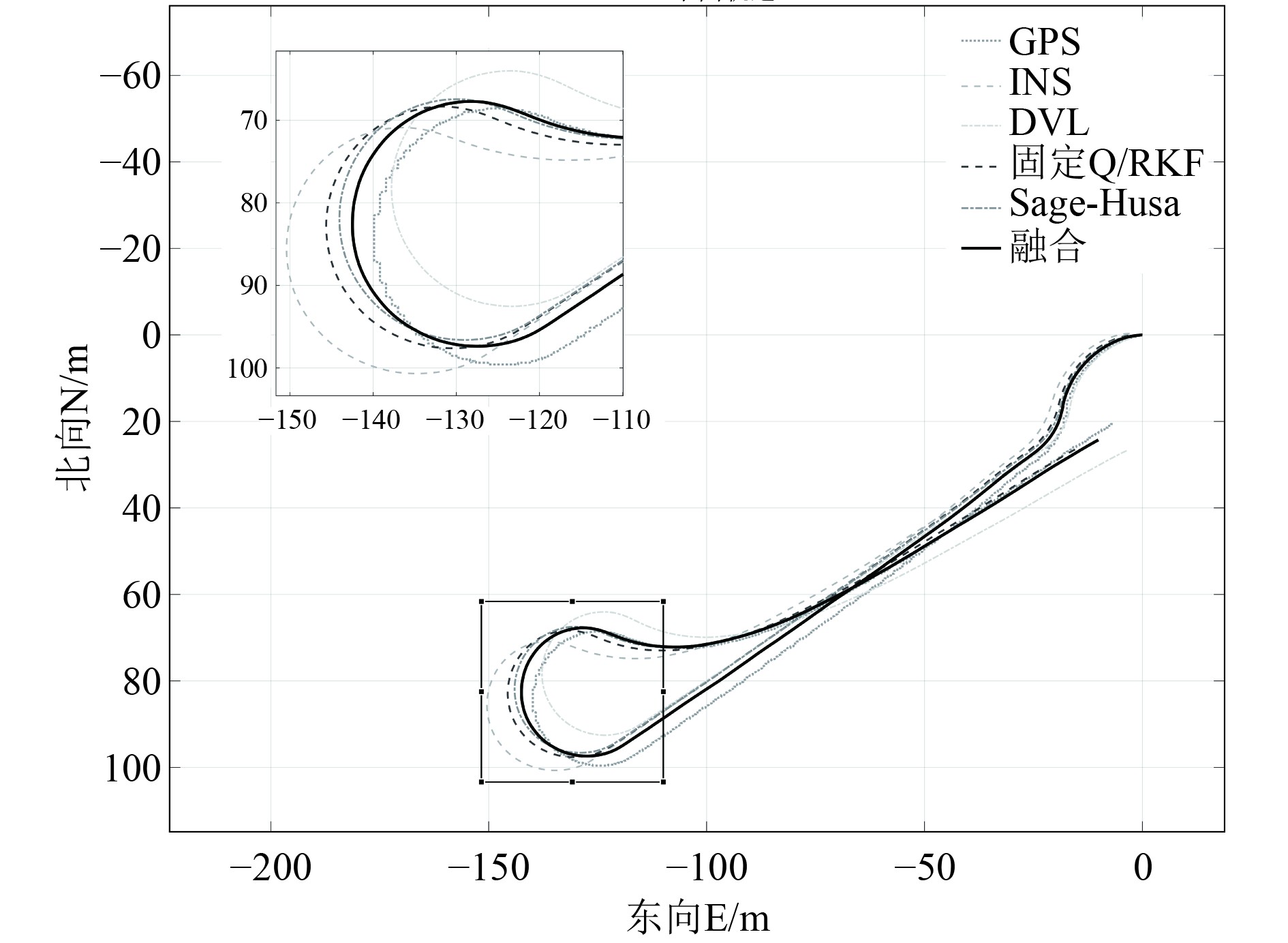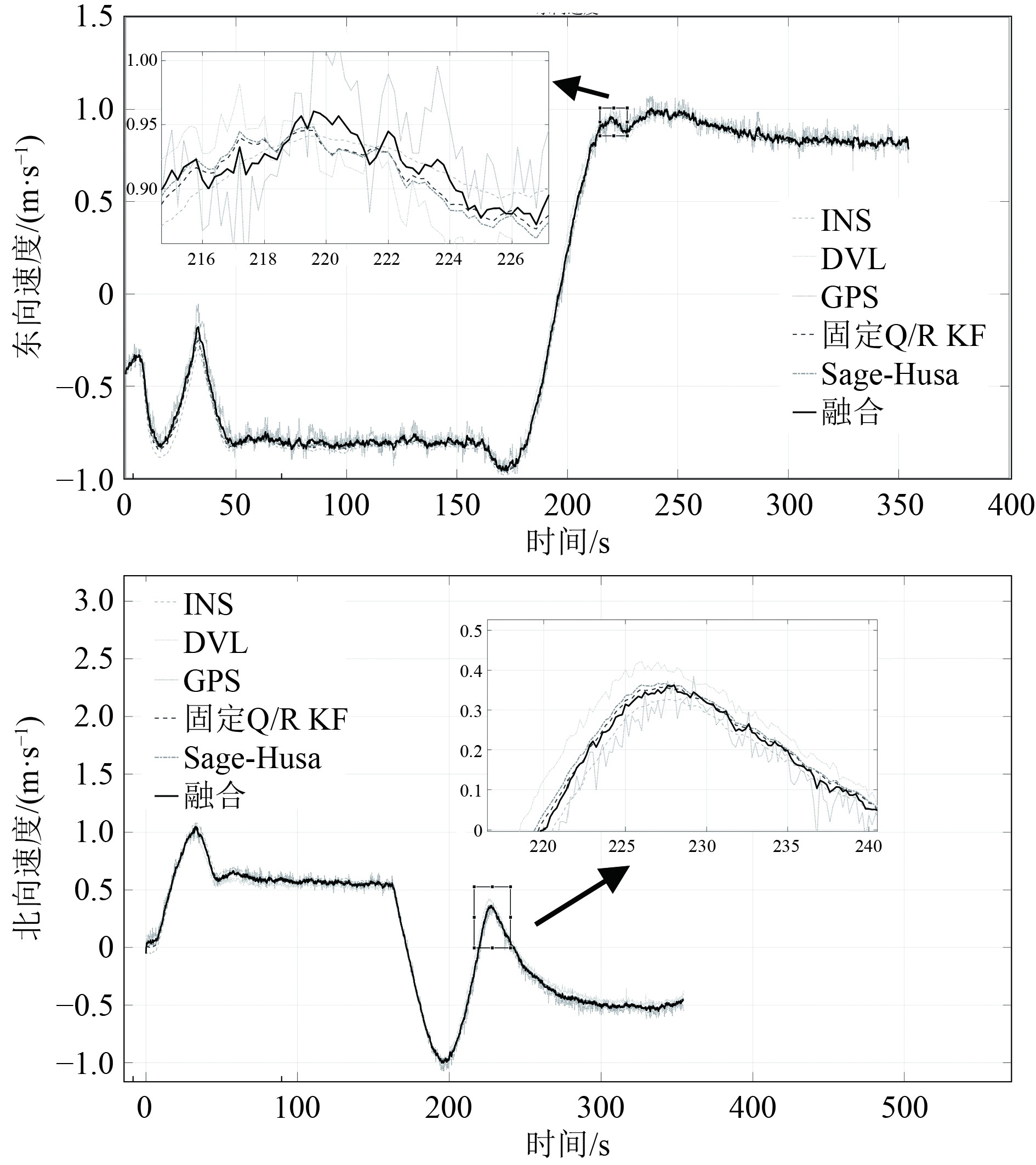 在图5与图6中GPS轨迹采用灰色点虚线,INS与DVL分别采用稀疏的横点线与紧密的横点线来进行区分,长虚线则表示固定Q/R的卡尔曼滤波结果,相对较粗的横点线表示Sage-Husa自适应卡尔曼滤波结果,最后黑色实现表示本文的算法结果。可以看出,东方向上INS与DVL分别存在积分漂移和瞬时抖动。固定Q/R算法的卡尔曼滤波存在明显的滞后,Sage-Husa算法为抑制噪声而产生的幅值压缩和时滞现象更为显著,本文算法相较于两者更加贴近GPS真值。北方向上INS依旧存在长时间的漂移,DVL局部段收到干扰很大,同样的固定Q/R与SH 卡尔曼算法整体上平滑,但是在峰值位置与下降沿存在滞后,本文算法能够在关键动态上更贴近准线。整体上,本文方法牺牲了少量的平滑性,以换取更高的数据精准度。