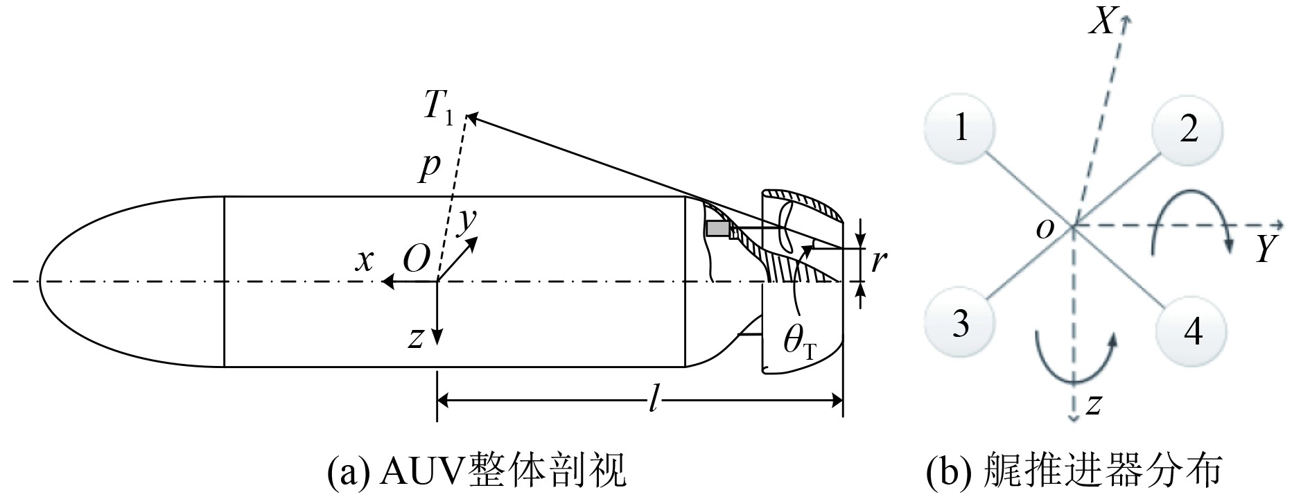 AUV尾部推进器分布方式如图1(b)所示,采用后置四螺旋桨配置,呈交叉X型对称排列,推进器的矢量布局为AUV实现任意姿态运动建立了基础。通过建立四通道独立推力控制模型,利用4个螺旋桨之间转速差模拟矢量推进器,实现航向偏转与俯仰姿态的精确控制,同时推进器反转推力为紧急制动提供了快速响应能力[9]。
