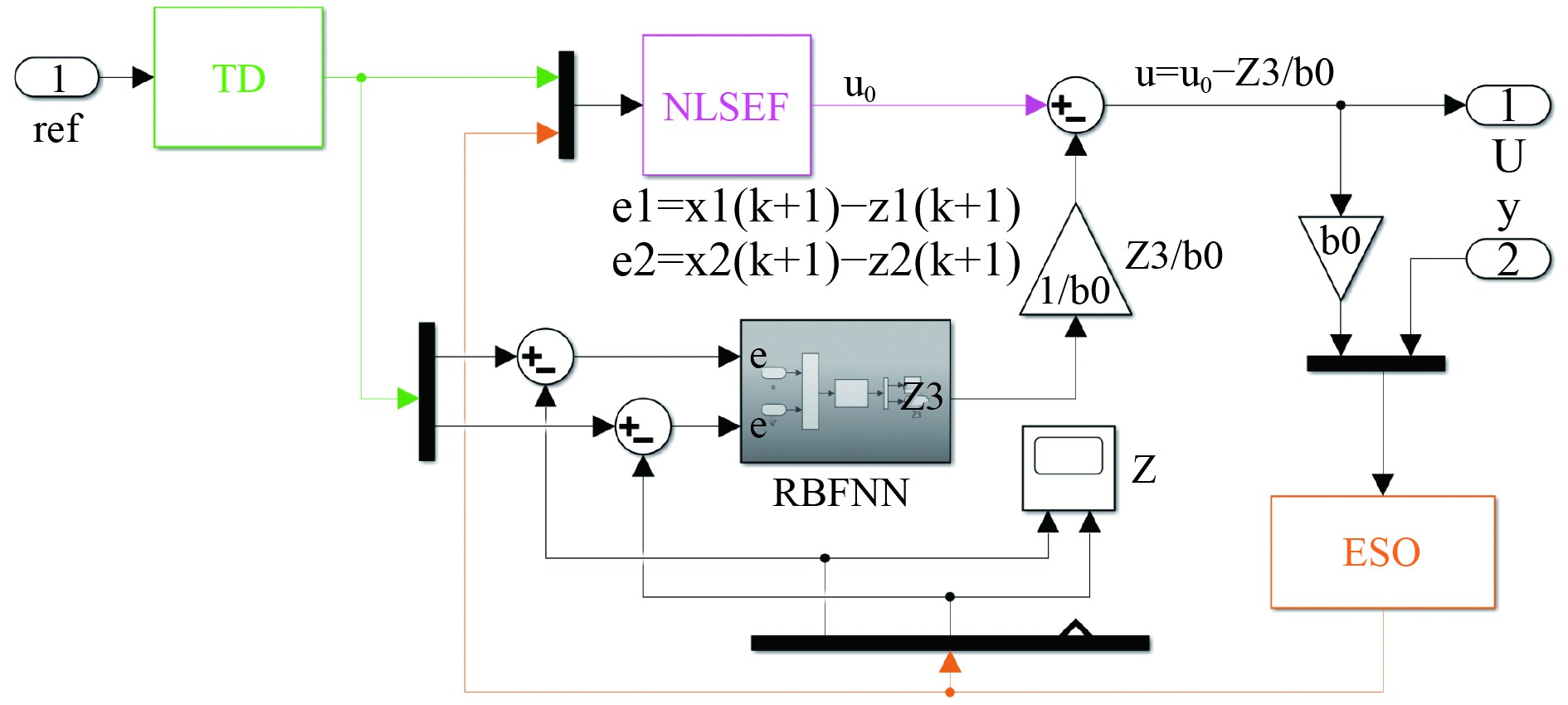相比于传统ADRC控制器,它的核心是增添了一个RBFNN模块。其输入为TD与ESO这2个模块输出的差值,输出为估计得到的总扰动,包含系统内部通道之间的全部耦合信息,用于替换原来ESO的输出信号