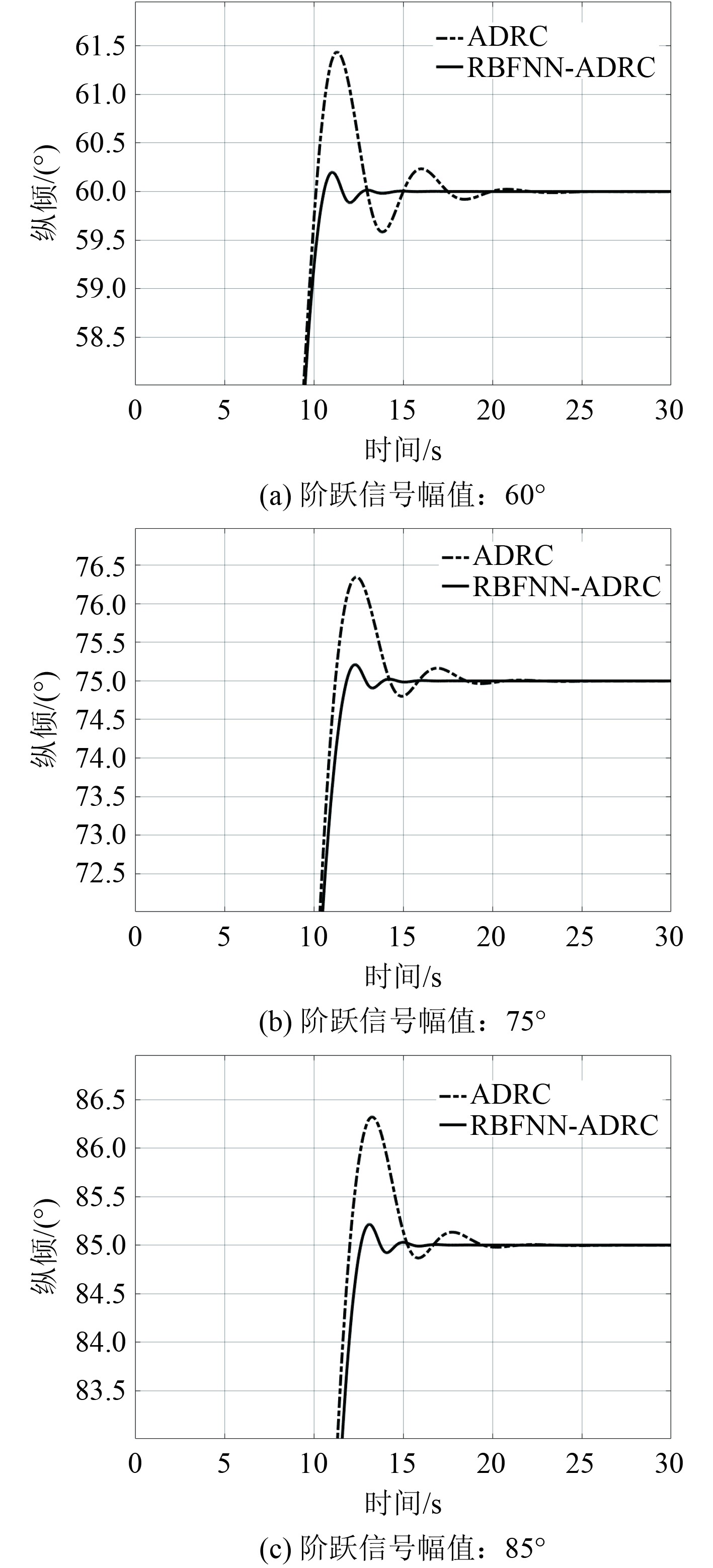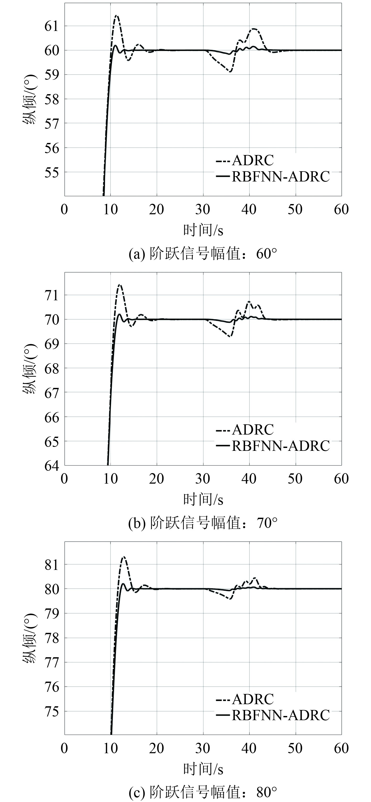 为了测试复合型控制器相比于传统ADRC控制器的动态性能,设置了纵倾角跟踪控制仿真实验,分别设置了不同幅值的阶跃输入信号,仿真结果见图13。