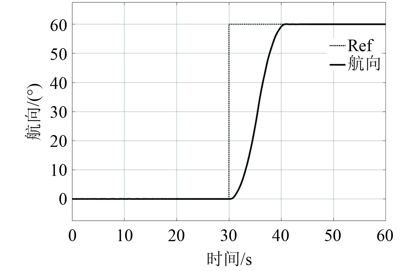 3.3 动态响应仿真实验为了比较动态输入下系统的响应性能,设计了AUV纵倾角跟踪控制仿真实验。输入信号为幅值为40的正弦信号,分别设置RBFNN-ADRC复合型控制器与PID控制器,PID控制器参数进行等效ADRC参数整定,结果如图15所示。
