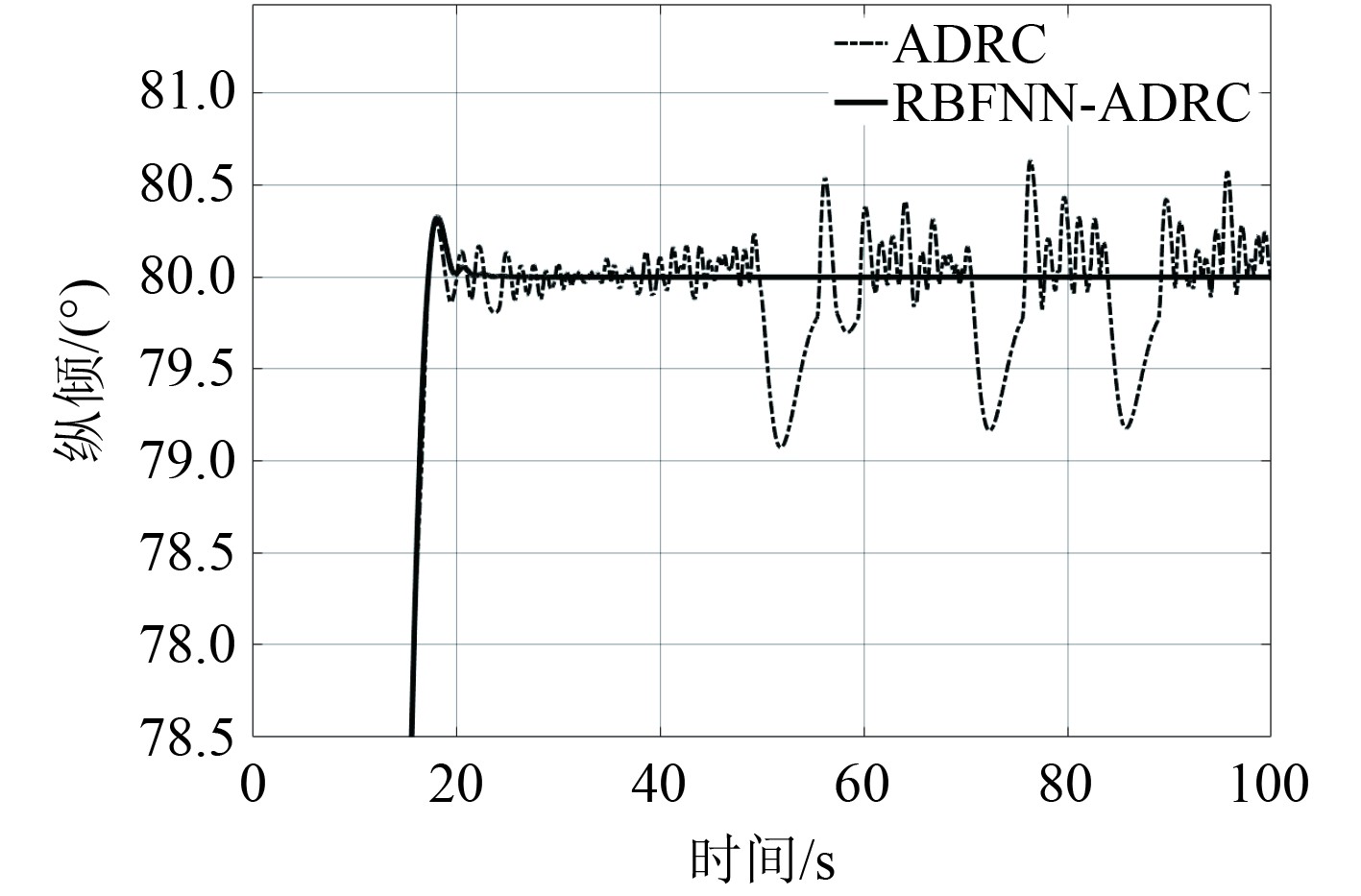 根据仿真结果可以发现,基于RBFNN-ADRC复合型控制器在进入稳态后曲线非常平稳,而传统ADRC控制器则出现了一定程度的波动。因为RBFNN-ADRC复合型控制器的RBFNN模块观测出来的扰动更加平滑,从而减少了控制器的抖振。